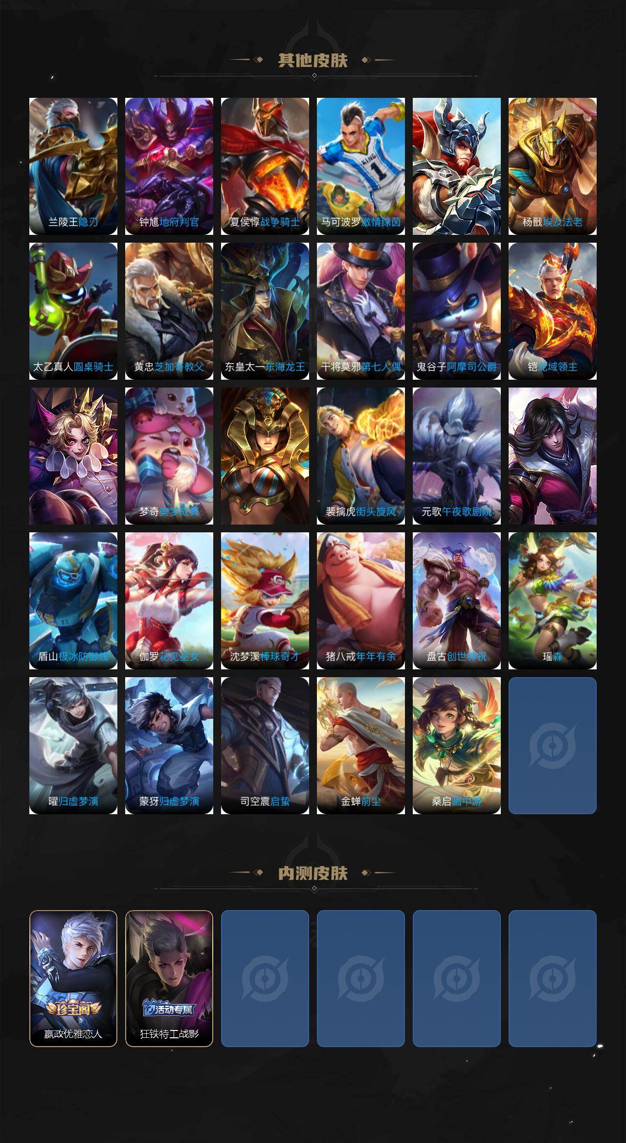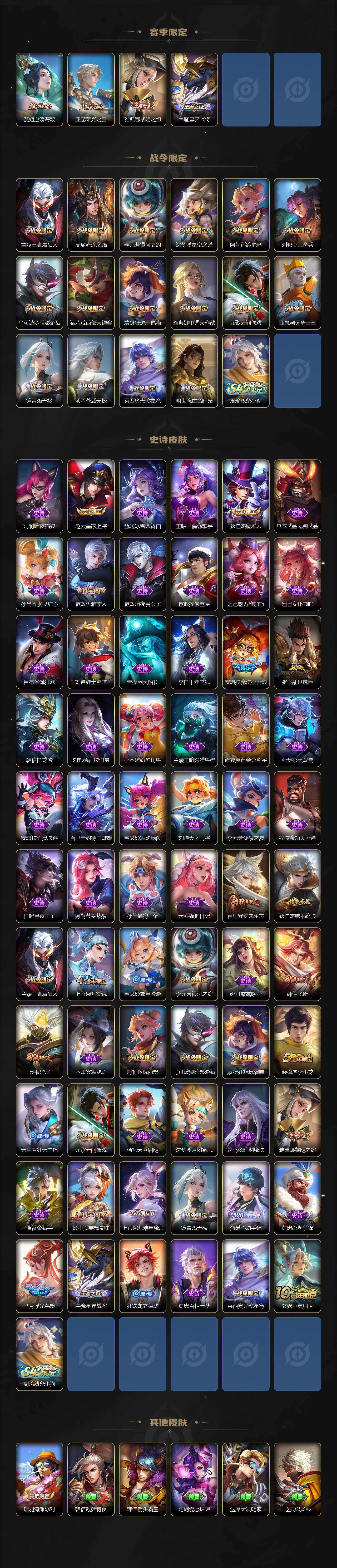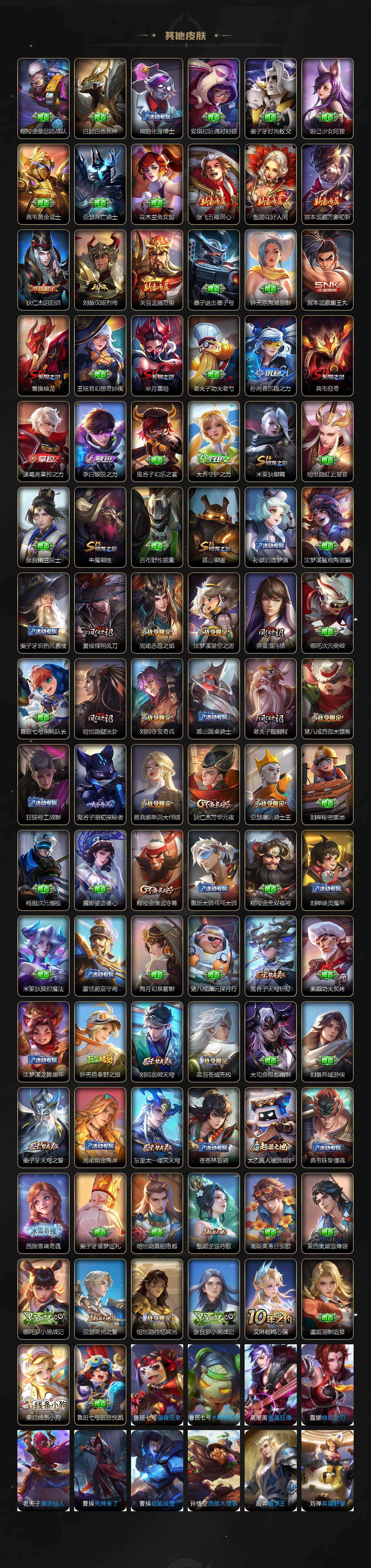 【传说皮肤】:后羿神树通天,夏侯惇霜北刀,露娜霜月吟,孙策末日机甲,铠绛天战甲,镜炽阳神光,貂蝉猫影幻舞,干将莫邪久胜战神,虞姬云霓雀翎,达摩黄金