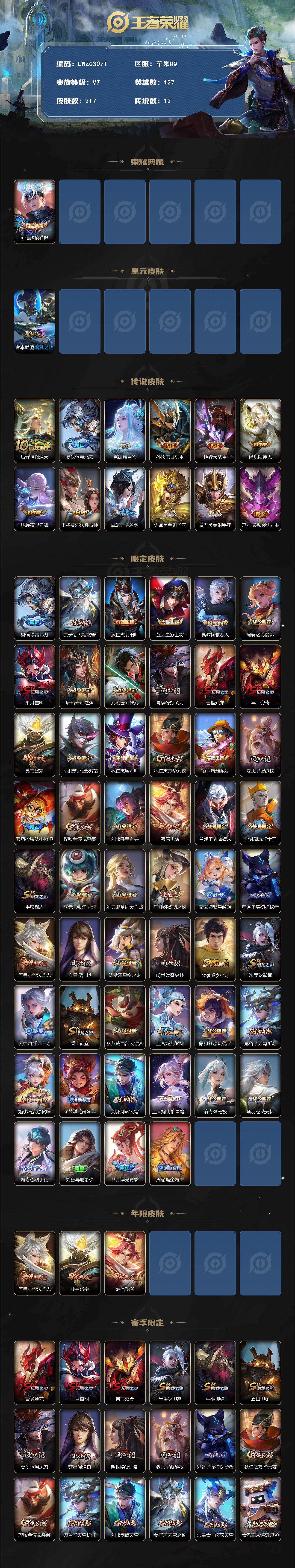 【特价出售/店主推荐/2市标/】:苹果Q-V7-最强王者段位-127英雄-217皮肤-1典藏皮肤-1星元-12传说-66史诗