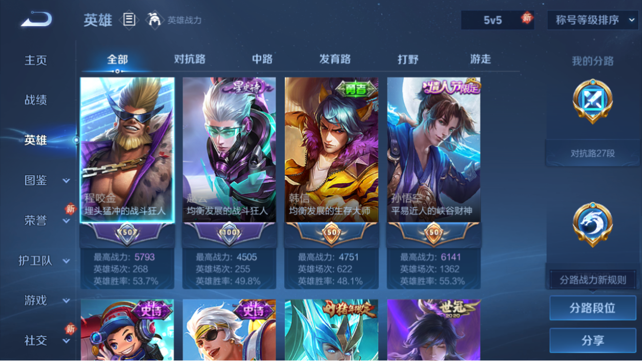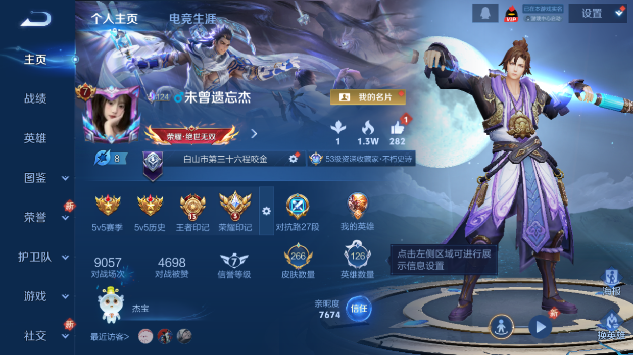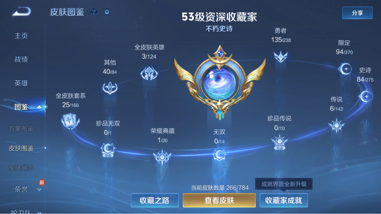 韩信典藏+踏浪归!皮肤数量266印记总数16V7荣耀王者暂时