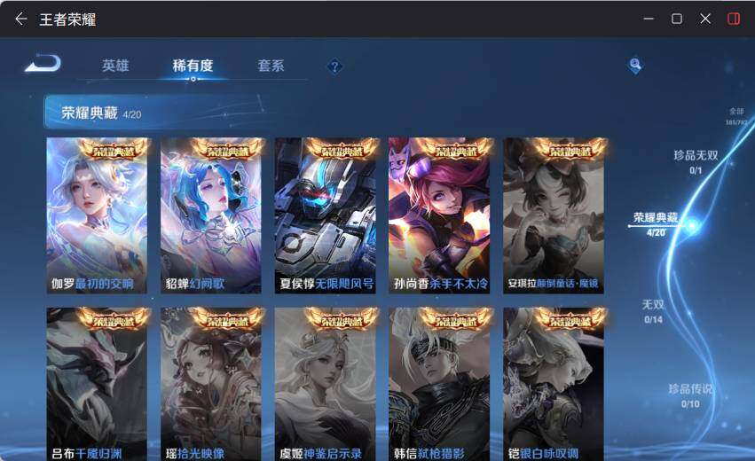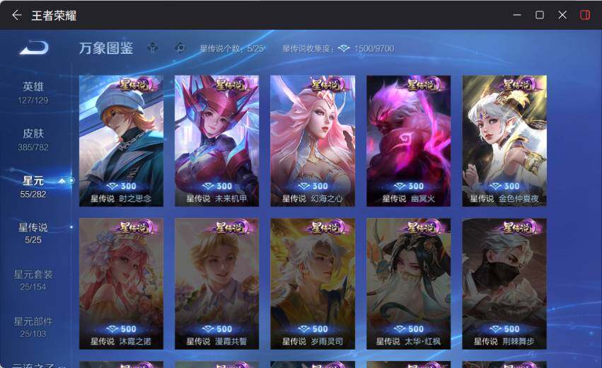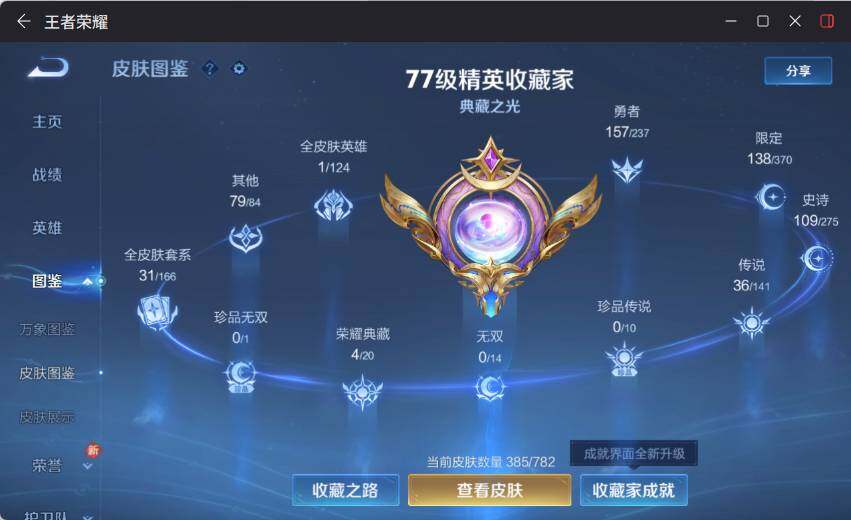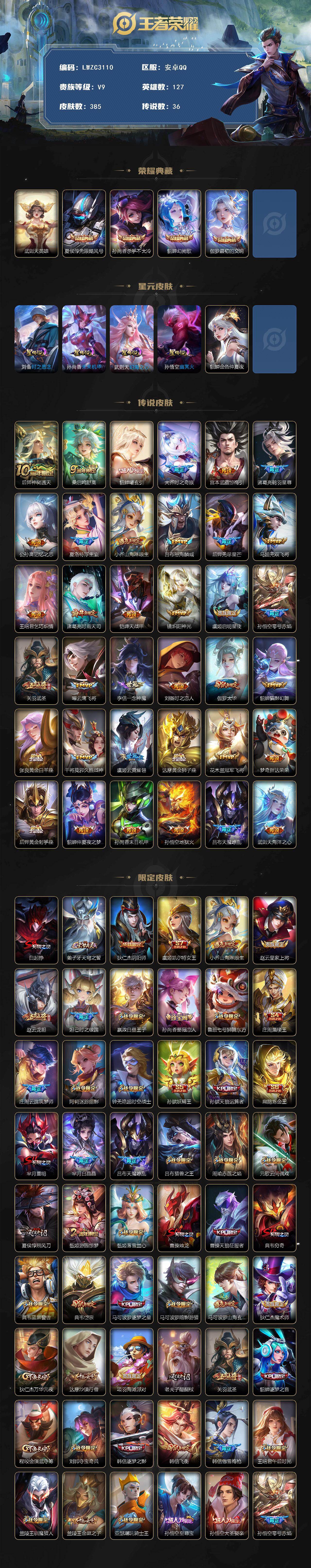V9-最强王者段位-127英雄-385皮肤-4典藏皮肤-1典藏英雄-5星元-36传说-109史诗