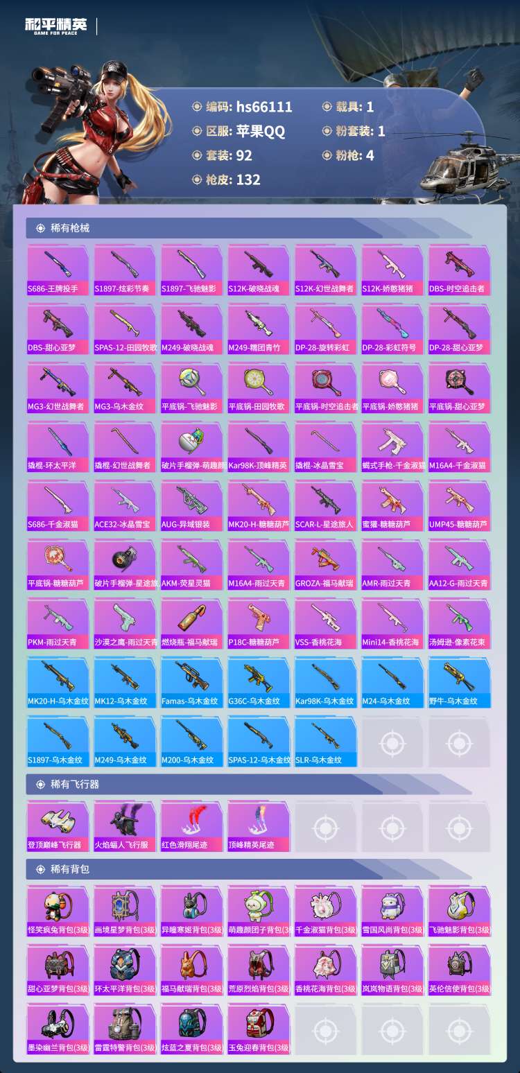 hs66111 苹果手Q-5王牌印记-1粉装-4特效枪-1载具-37546热力值-92套装-132枪