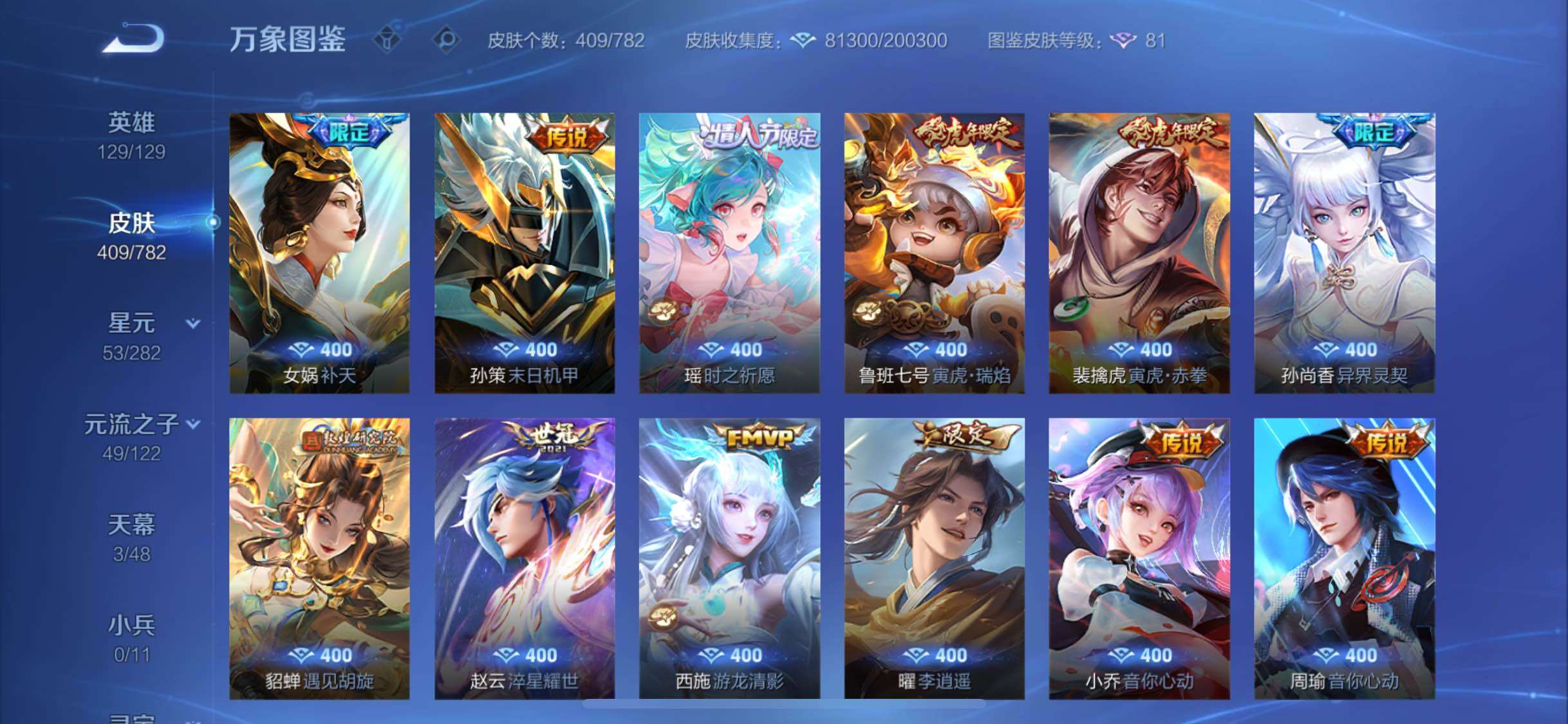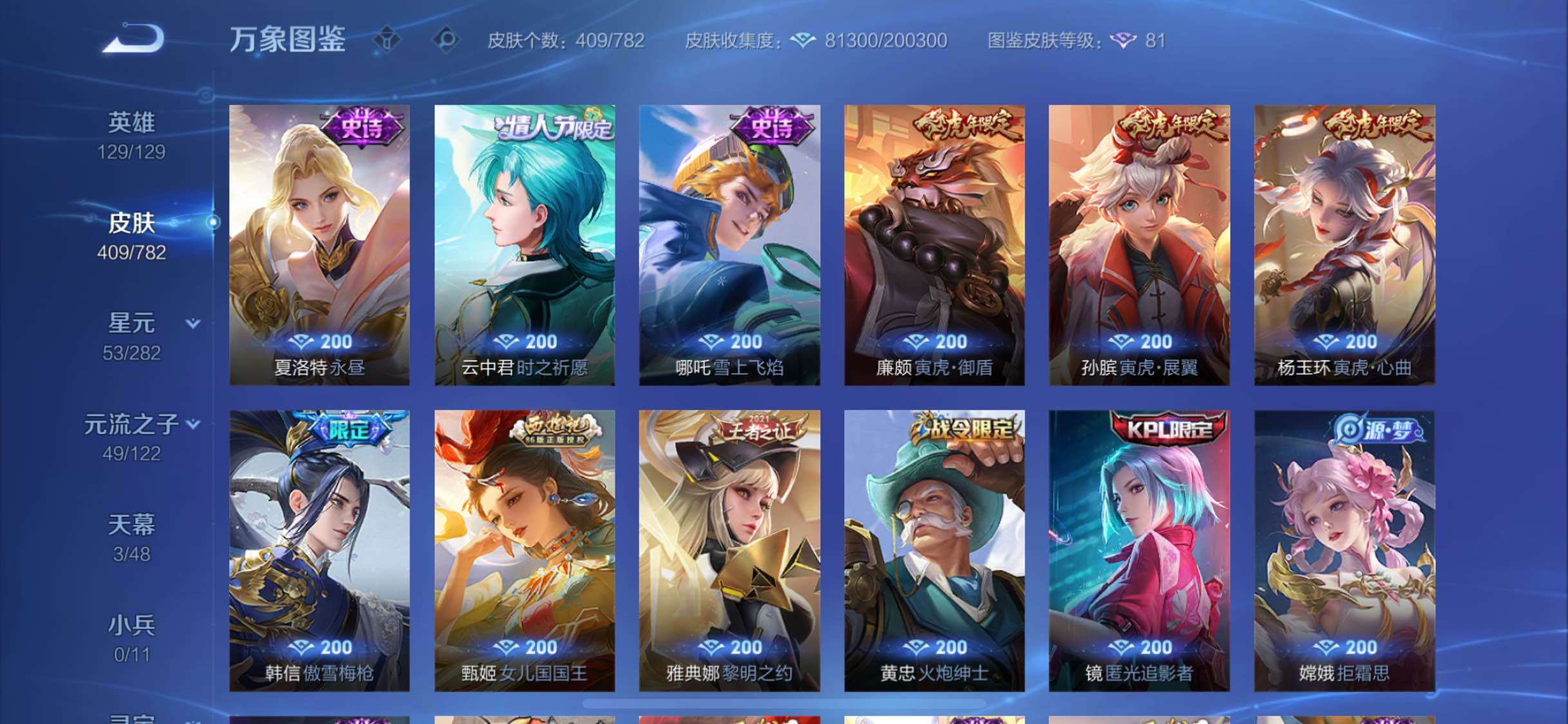 129英雄-409皮肤-19王者印记-300铭文-贵族积分24w