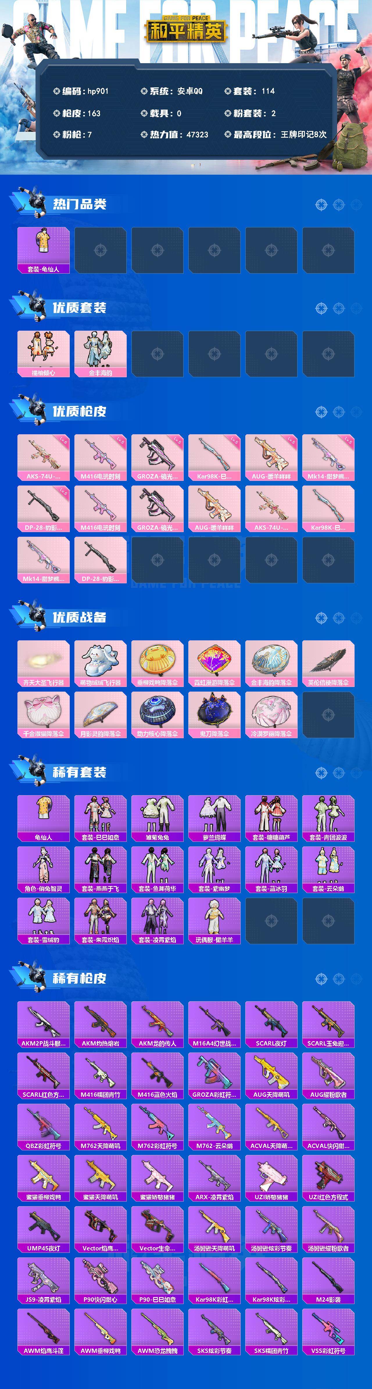 安卓 手Q-2粉装-7特效枪-0载具-2粉色飞行器-47323热力值-8王牌印记-114套装-163枪皮