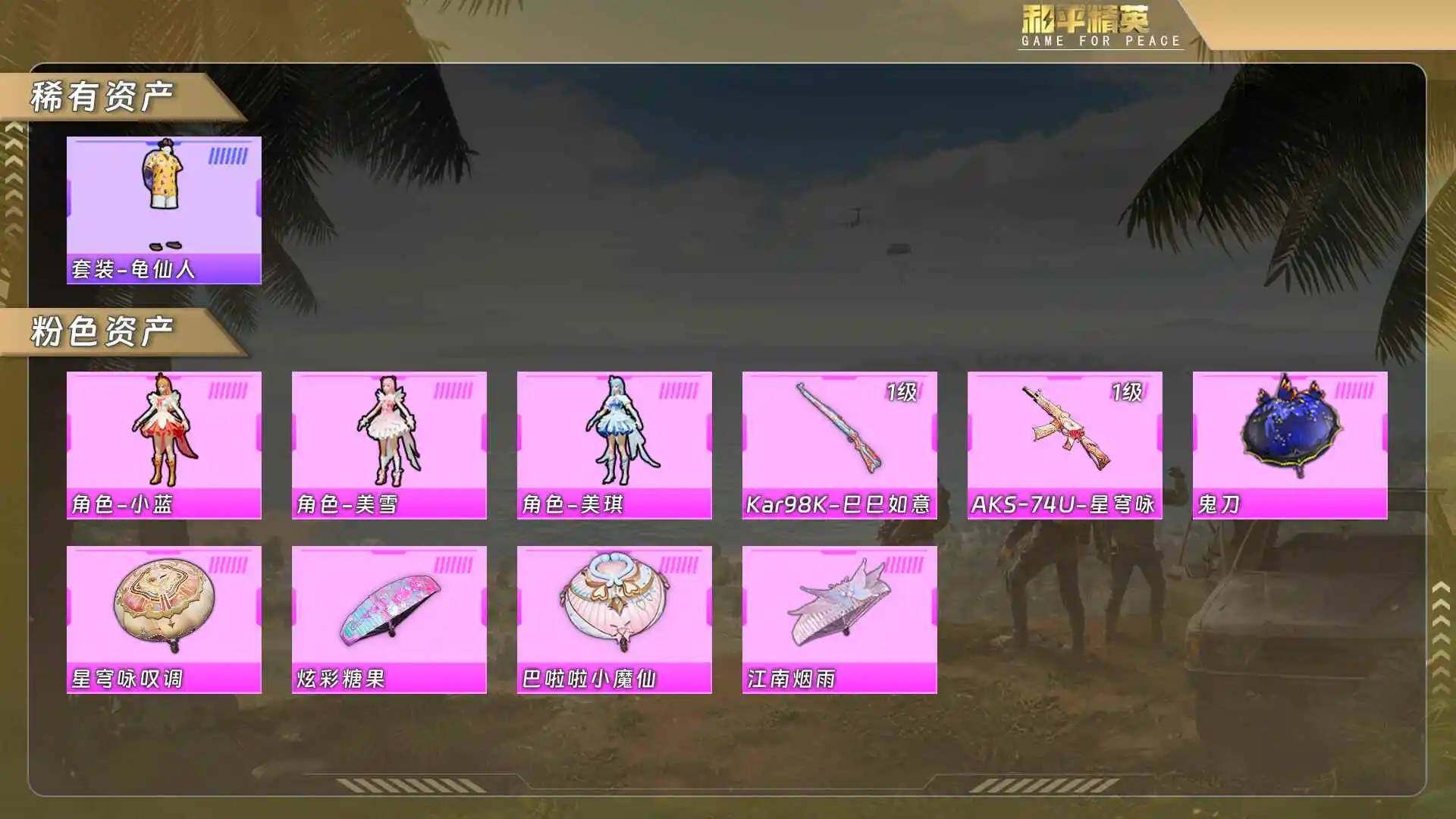 安(3粉装2粉枪)龟仙人/小蓝/美雪/美琪/Kar98K巳巳如意1级/AKS74U星穹咏叹调1级 没战神框HP6893-0载具-0粉色飞行器-9544热力值-0王牌印记-24套装-34枪皮