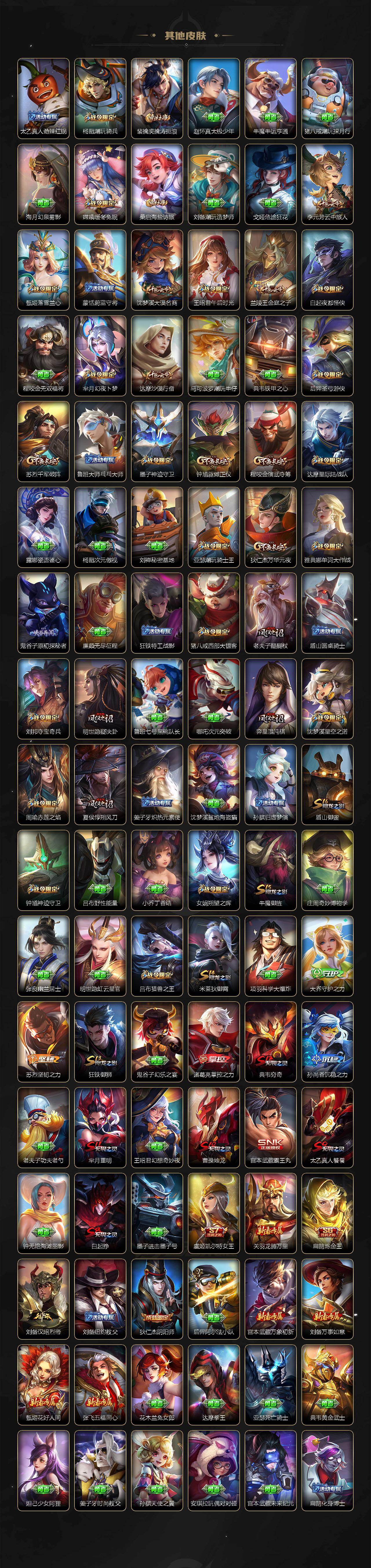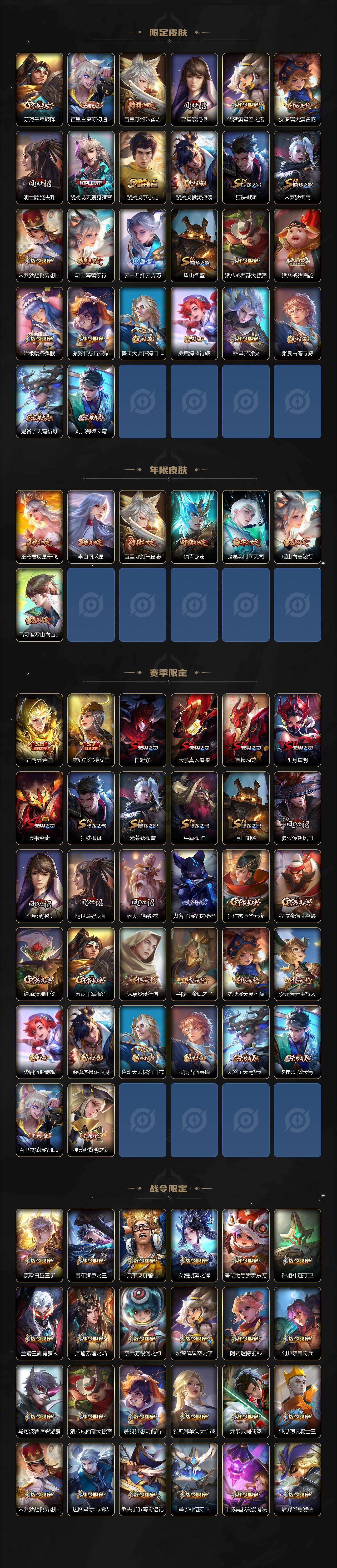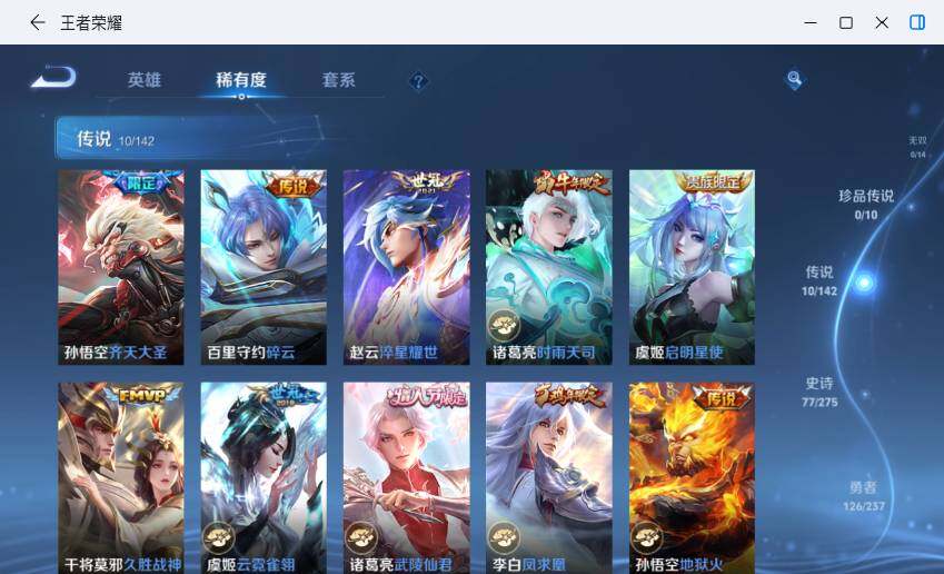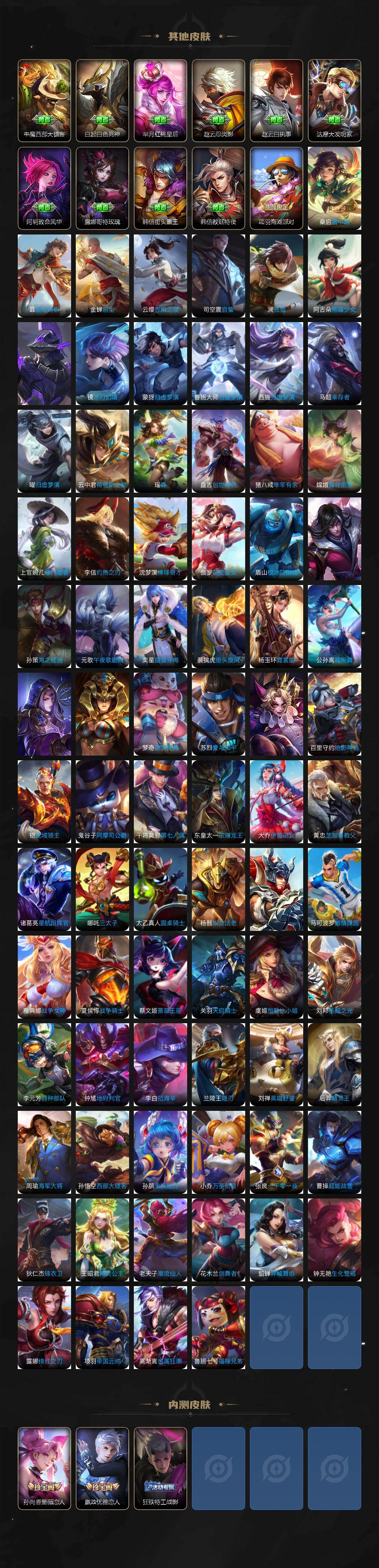 【传说皮肤】:孙悟空齐天大圣,百里守约碎云,赵云淬星耀世,诸葛亮时雨天司,虞姬启明星使,干将莫邪久胜战神,虞姬