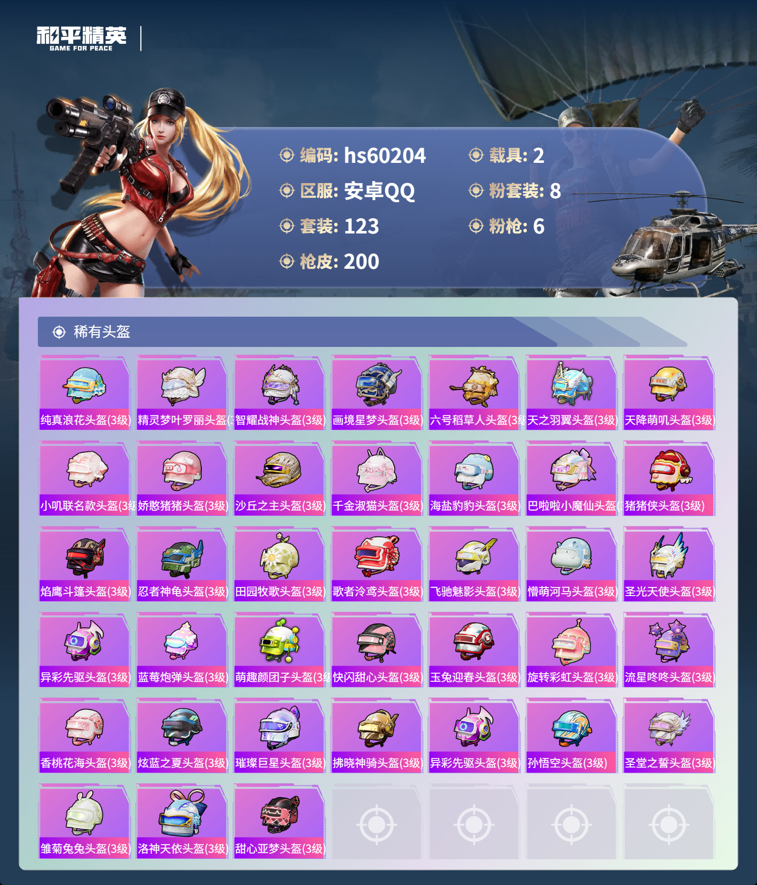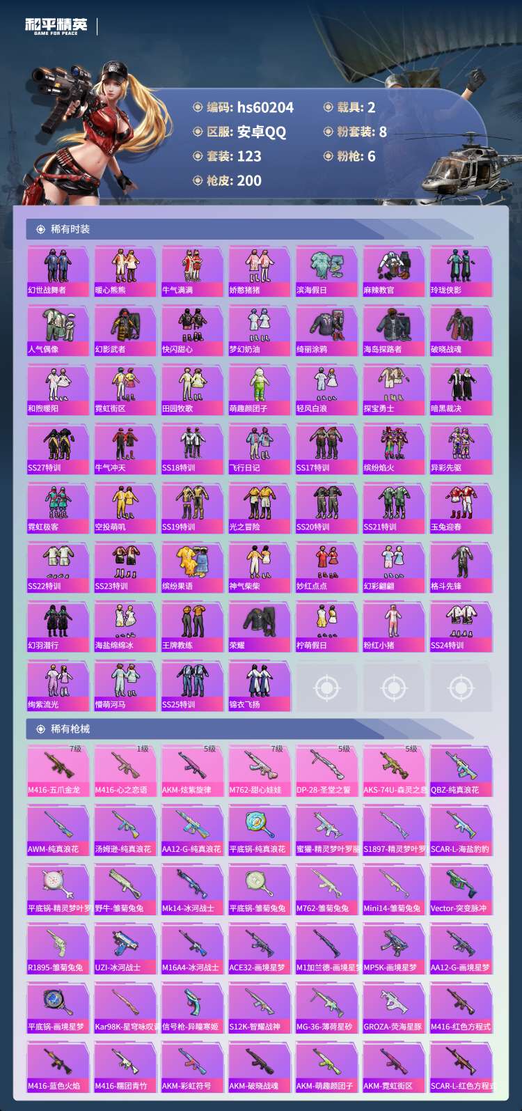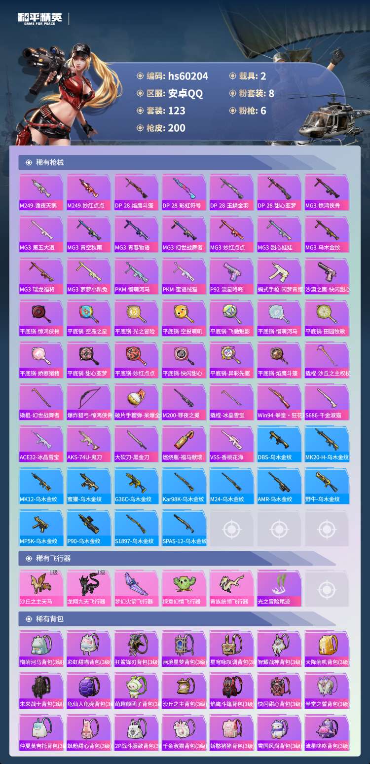 hs60204 安卓手Q-10王牌印记-8粉装-6特效枪-2载具-66157热力值-123套装-20
