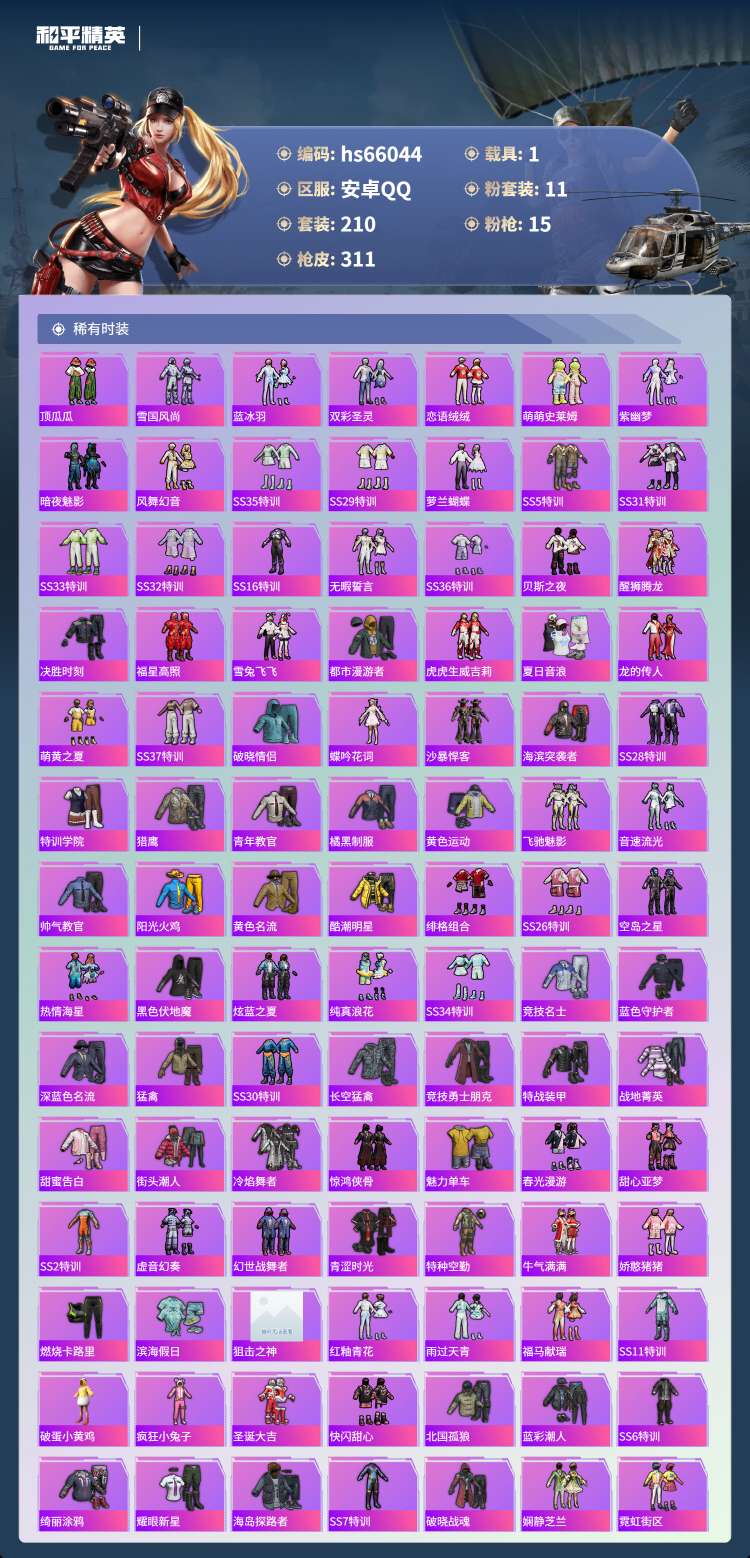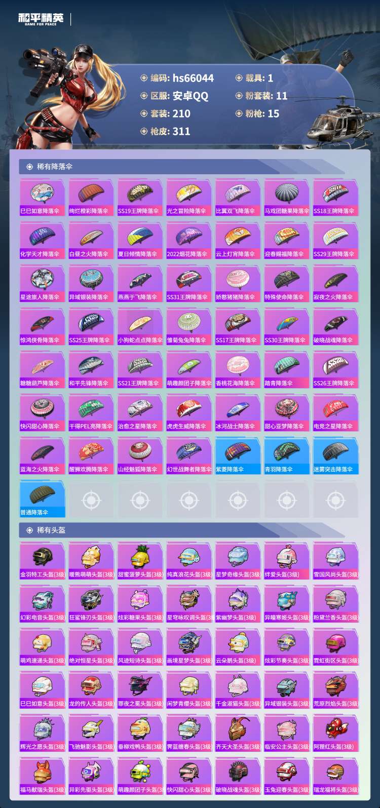 hs66044 安卓手Q-19王牌印记-11粉装-15特效枪-1载具-96225热力值-210套装-