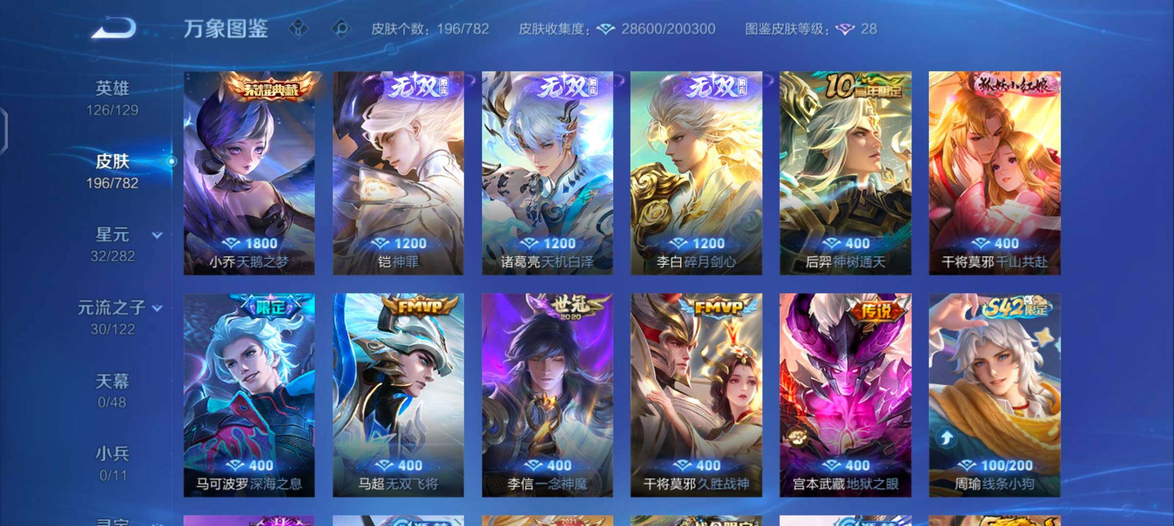 126英雄-196皮肤-10王者印记-150铭文-贵族积分3w