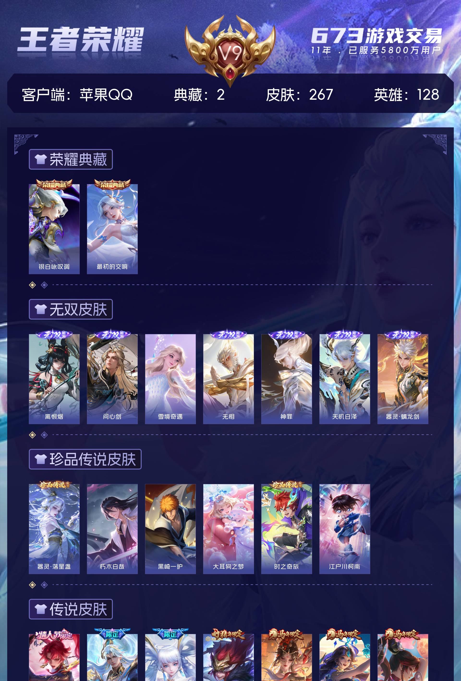 V9 皮肤267 英雄128 非凡王者 荣耀典藏2 无双皮肤7 珍品传说6 星传说2 传说47