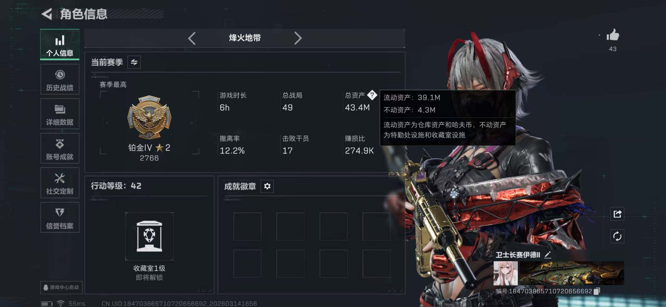 【SJ1396】43m总资产-5907k哈夫币-42烽火等级-铂金-29战场等