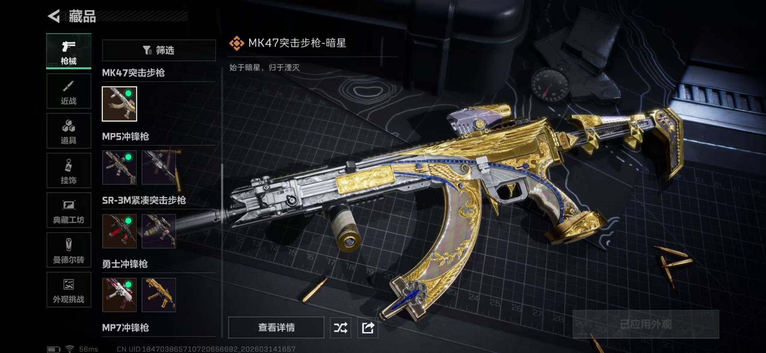【传说外观】:M4A1突击步枪-蚀金玫瑰,ASh-12战斗步枪-鹅鸭杀,K416突击步枪-行动记录,SCAR-H战斗步枪-启航,CAR-15突击步枪-阿米娅,MK47突击步枪-暗星,SR-3M紧凑突击步枪-暗星,勇士冲锋枪-能天使-午夜邮差,