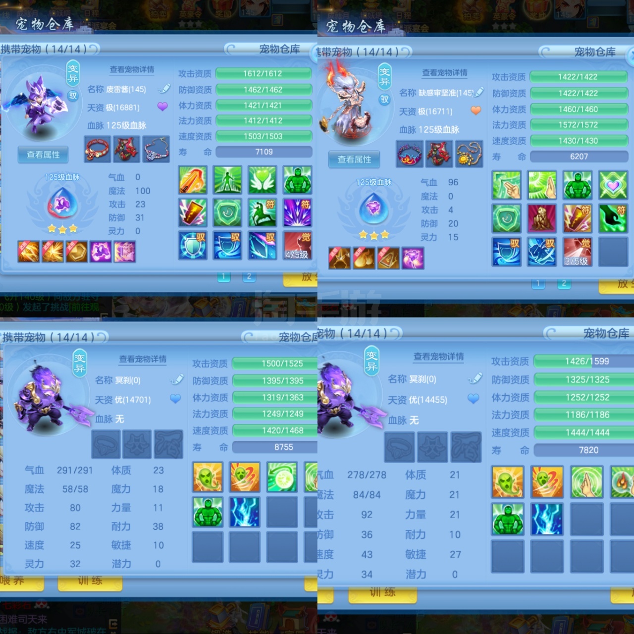 (140魔王/男)天下无双/邮箱不送/一年换绑/有双重--3件14段3星装备,不变卡1569灵,18个6技能,14只满兽魂,7个红纹3专属血脉,6只宠物皮肤,3个坐骑,海景房