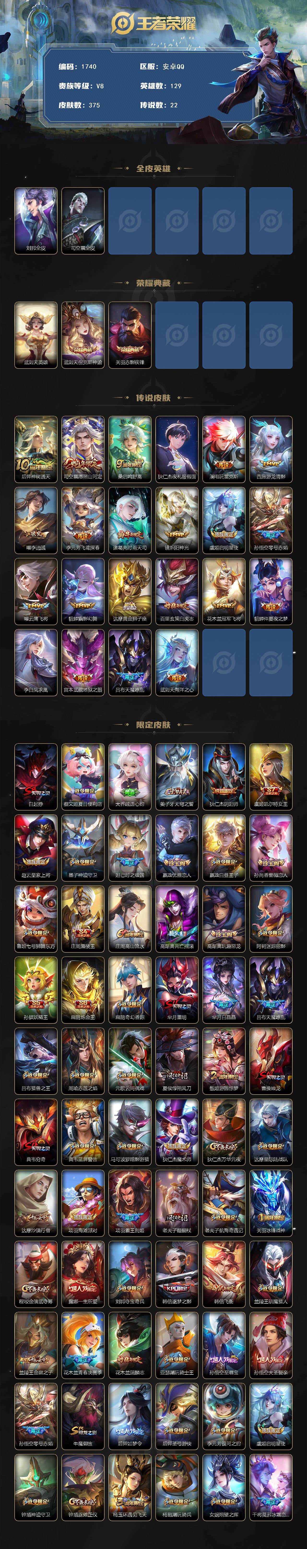 【375皮肤 司空震愿照山河定 关羽赤影疾锋 狄仁杰夜礼服假面 李逍遥 时雨天司 白虎志】安卓Q-V8-至尊星耀III段位-129英雄-375皮肤-2典藏皮肤-1典藏英雄-22传说-110史诗