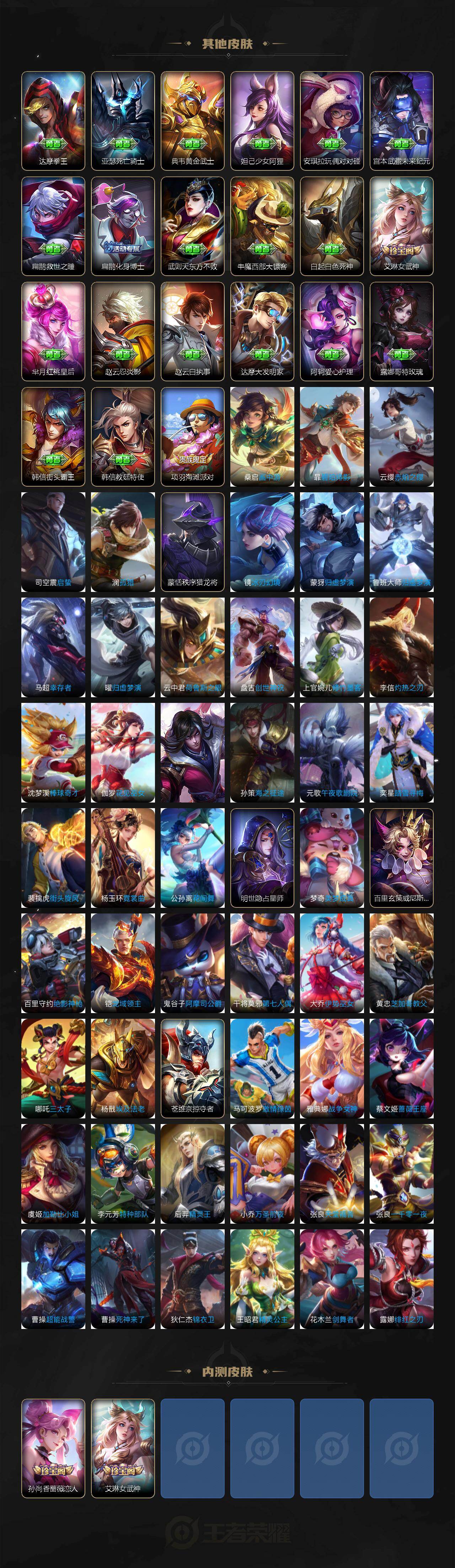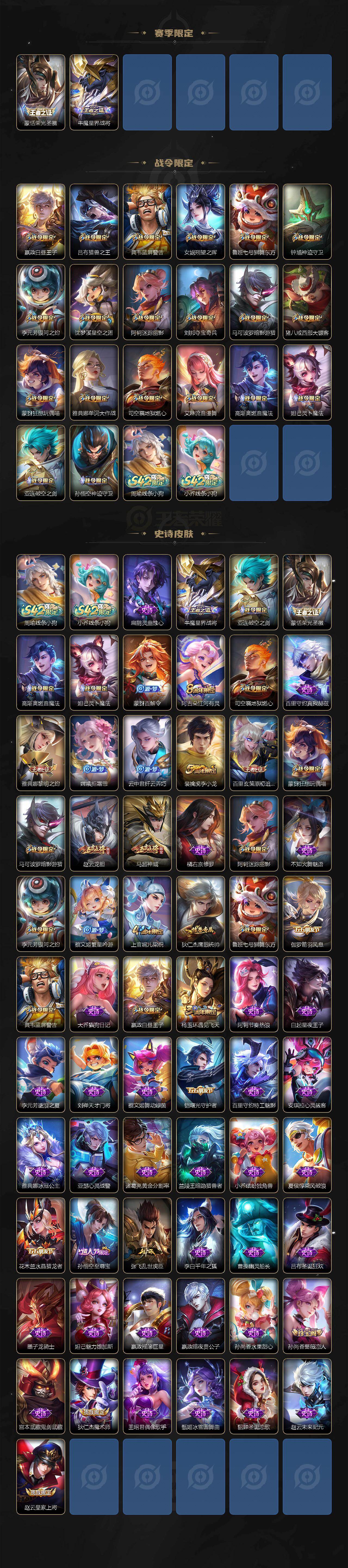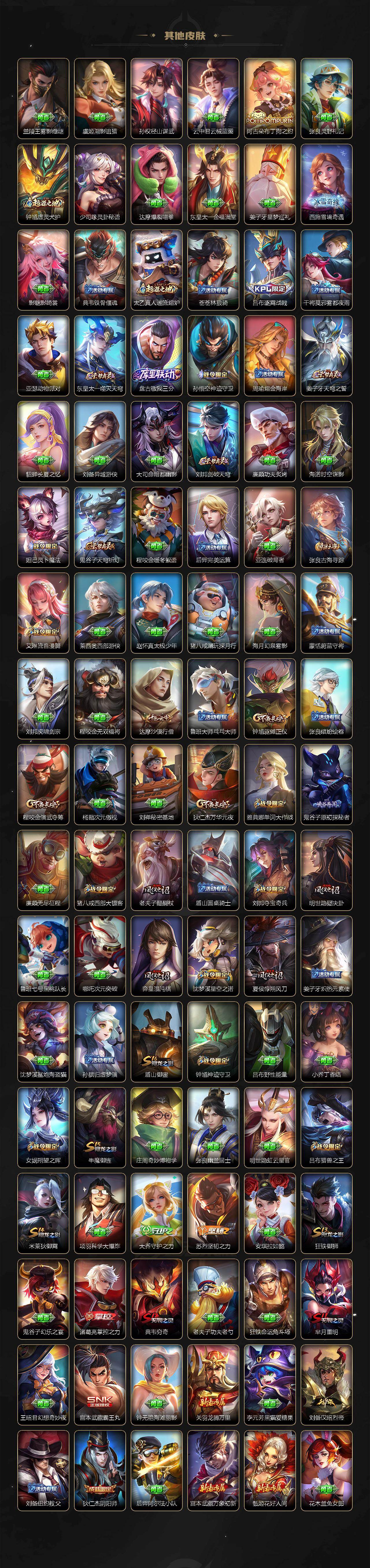 【限定皮肤】:姜子牙天穹之誓,狄仁杰阴阳师,赵云皇家上将,赵云龙胆,嬴政白昼王子,孙尚香蔷薇恋人,鲁班七号狮舞东方,阿轲迷踪丽影,芈月重明,吕布猎