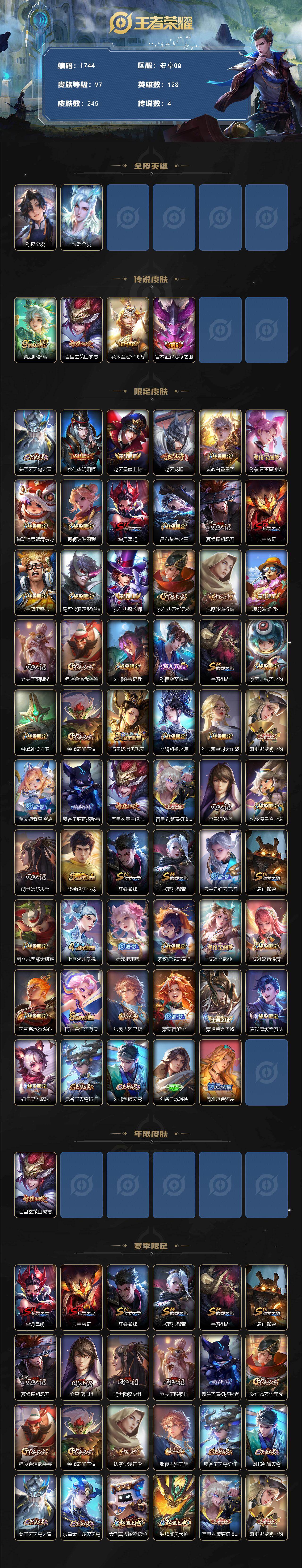 【打野号!!白虎志 至尊宝 地狱之眼星元】安卓Q-V7-最强王者段位-128英雄-245皮肤-4传说-65史诗