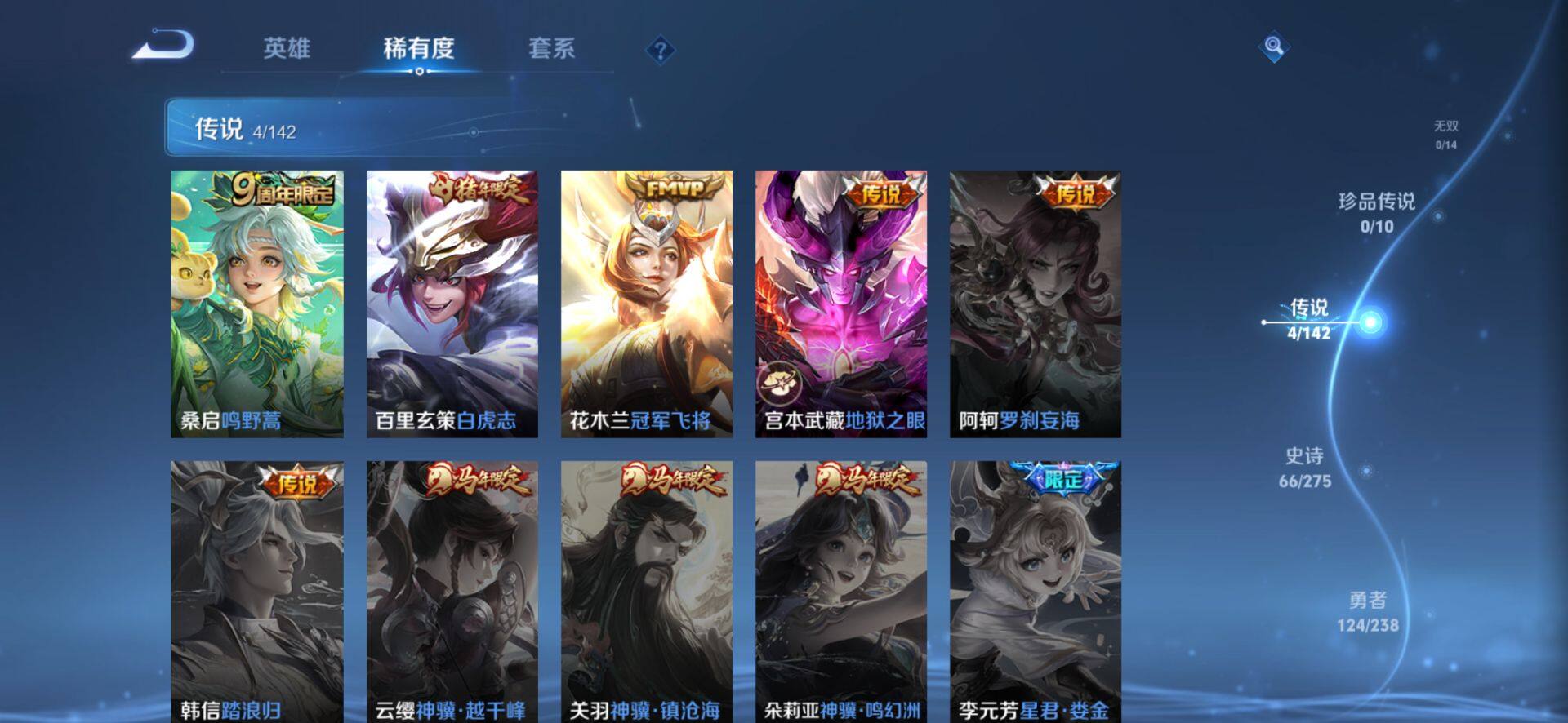 【传说皮肤】:桑启鸣野蒿,百里玄策白虎志,花木兰冠军飞将,宫本武藏地狱之眼
