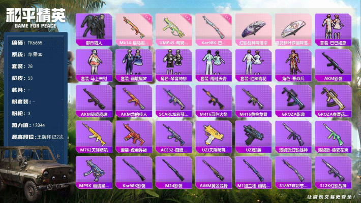 工背包头盔全套-M416-黄金龙骨-都市猎人-3特效枪-双字ID-身法素材号】苹果 手Q-0粉装-3特效枪-0载具-0粉色飞行器-12844热力值-2王牌印记-28套装-53枪皮 【热门品类】:套装-都市猎人 【粉色枪皮等级】:UMP45-萌骑冒险(三级),Kar98K-巳巳如意(一级),Mk14-福马献瑞(五级) 【粉色枪皮】:UMP45-萌骑冒险,Kar98K-巳巳如意,M