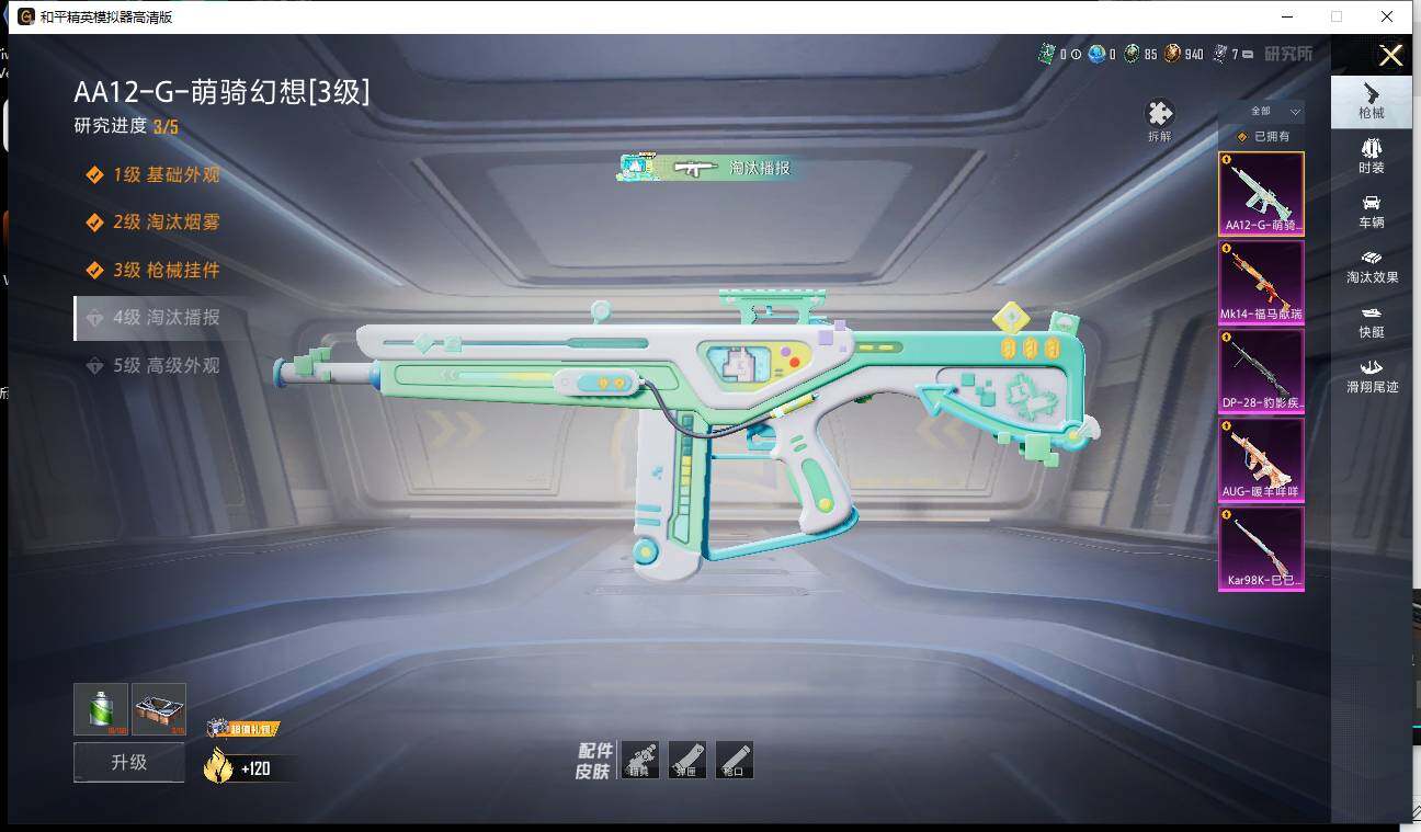 【粉色枪皮等级】:AUG-暖羊咩咩(五级),Kar98K-巳巳如意(五级),Mk14-福马献瑞(五级),AA12-G-萌骑幻想(三级),DP-28-豹影疾电(五级)