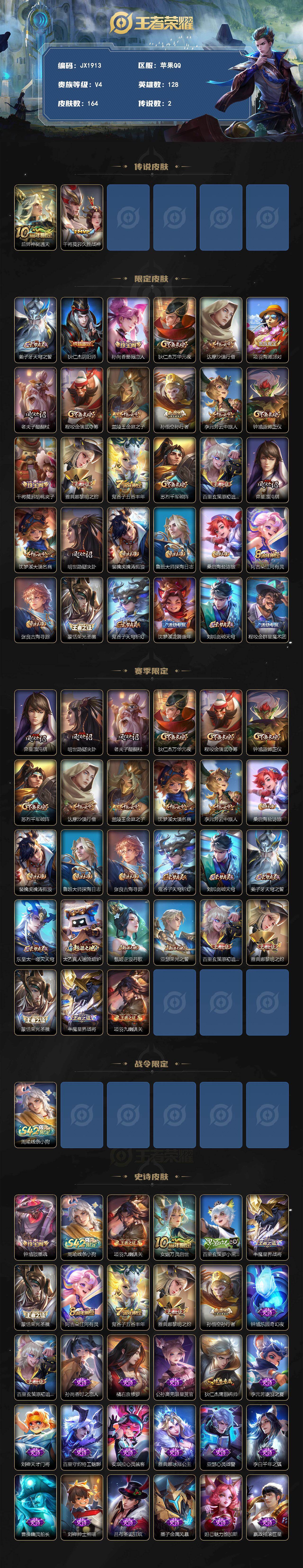 【JX1913】贵族4/皮肤164/传说2/史诗34/英雄128/后羿神树通天