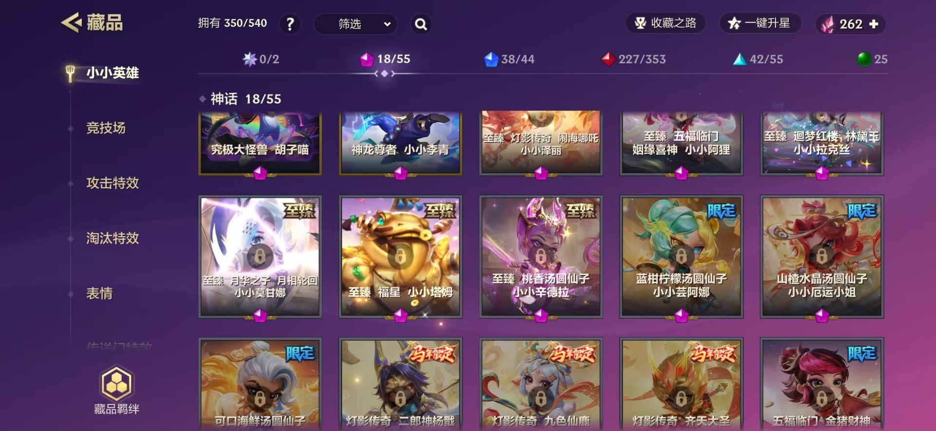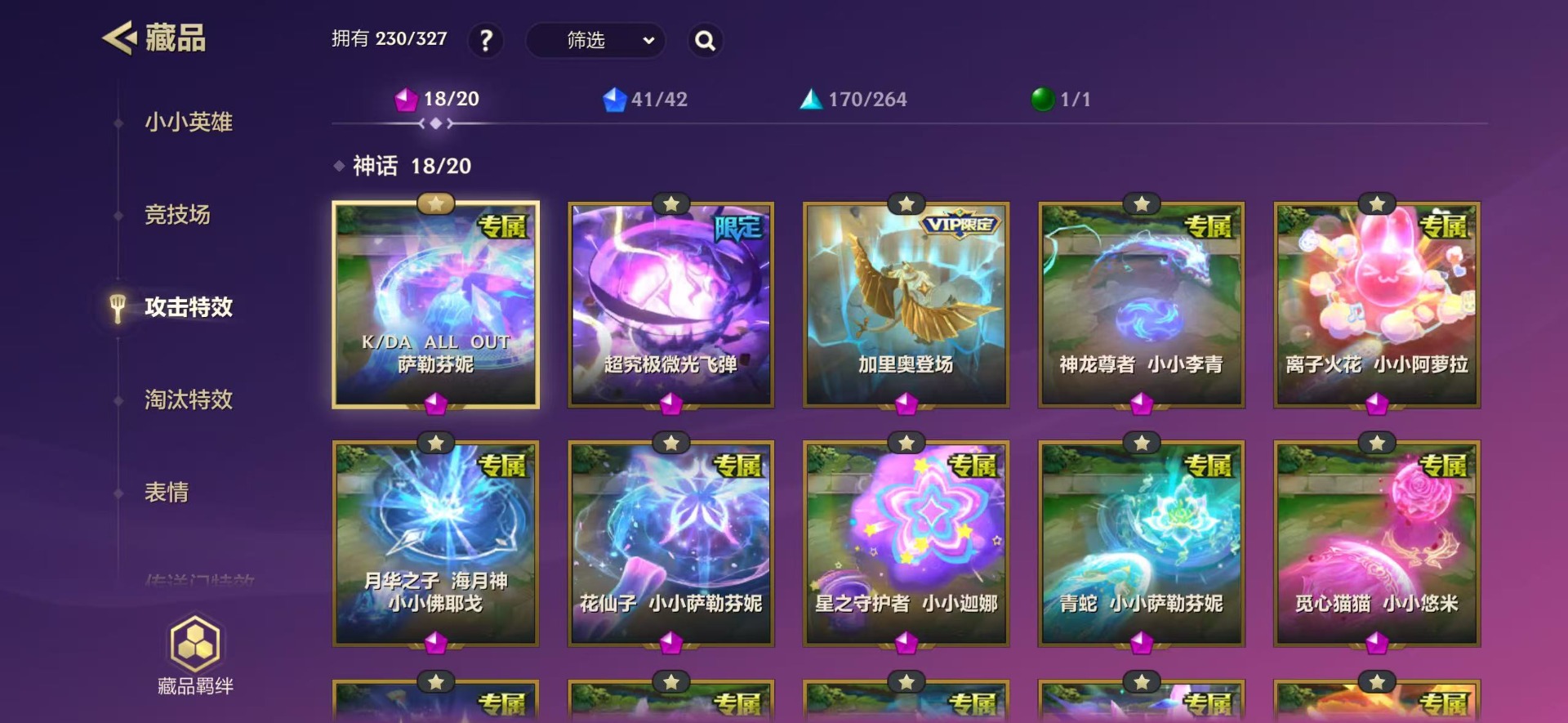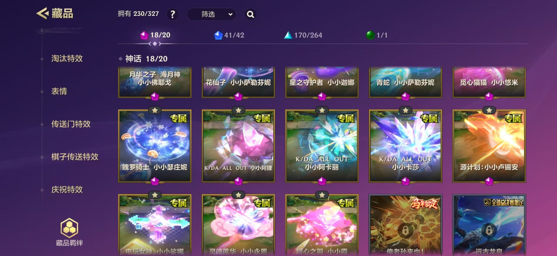 【小小英雄(神话)】花仙子 小小萨勒芬妮,魄罗骑士 小小瑟庄妮,青蛇 小小萨勒芬妮,月华之子 海月神 小小佛耶戈,星之守护者 小小迦娜,离子火花 小小阿萝拉,源计划:雷 小小卢锡安,甜心之翎 小小霞,灵魂莲华 小小永恩,电玩女神 小小娑娜,神龙尊者 小小李青,K/DA ALL OUT 小小阿卡丽,究极大怪兽 胡子喵,K/DA ALL OUT 小小阿狸,超级巨星 小小萨勒芬妮(K/DA),K/DA AL
