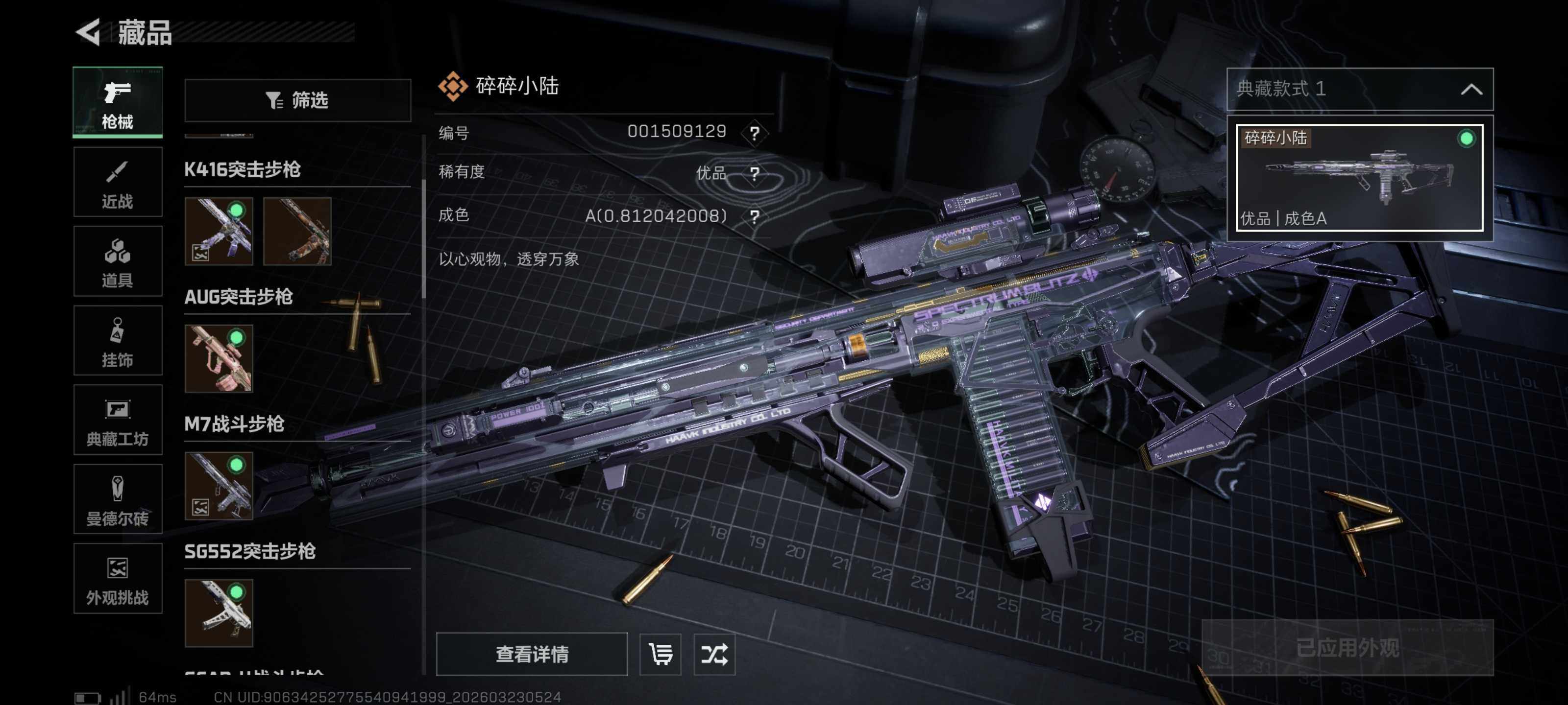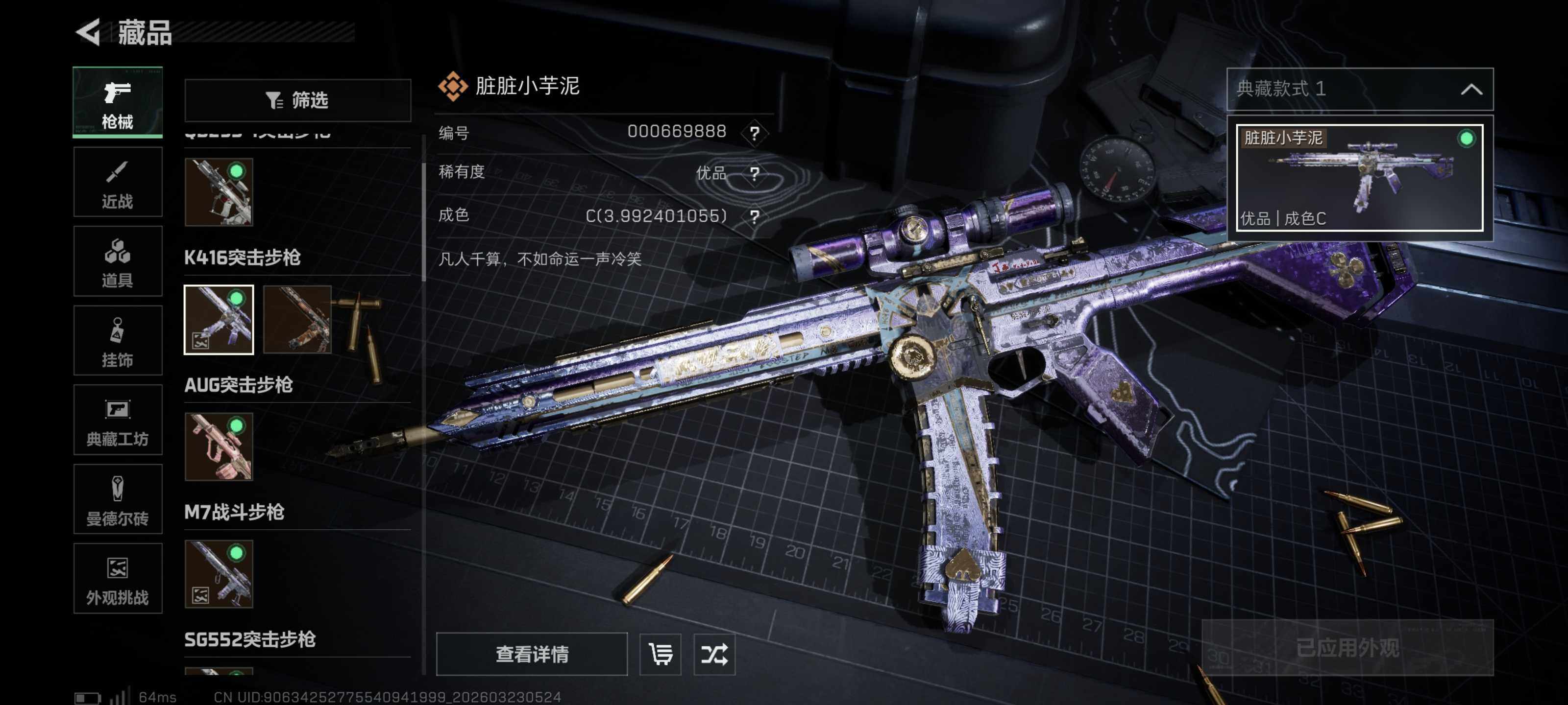 【典藏外观成色】:K416突击步枪-命运(优品C),M7战斗步枪-棱镜攻势S2(优品A