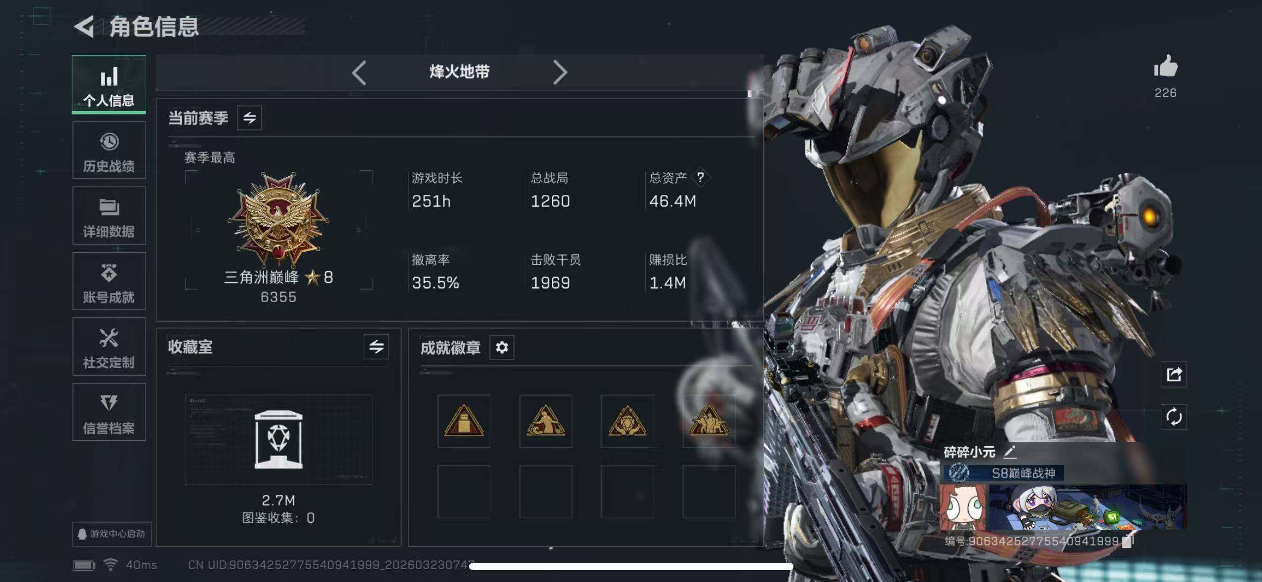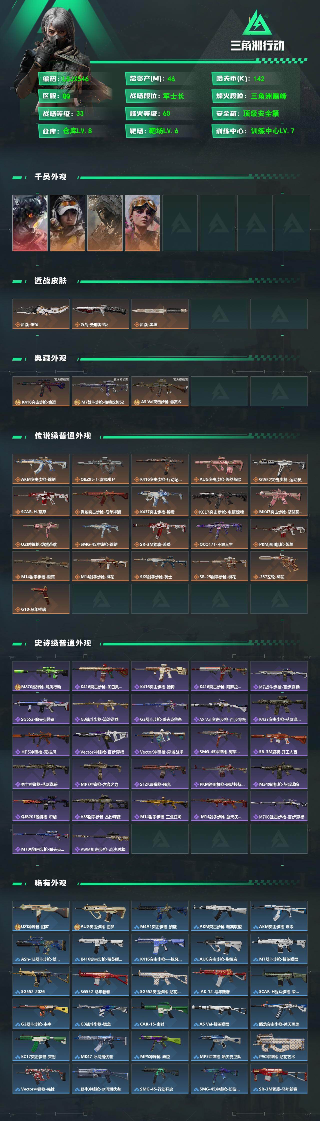 46m总资产-142k哈夫币-60烽火等级-三角洲巅峰-33战场等级-军士长