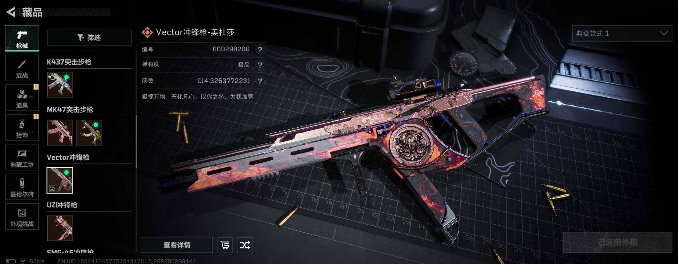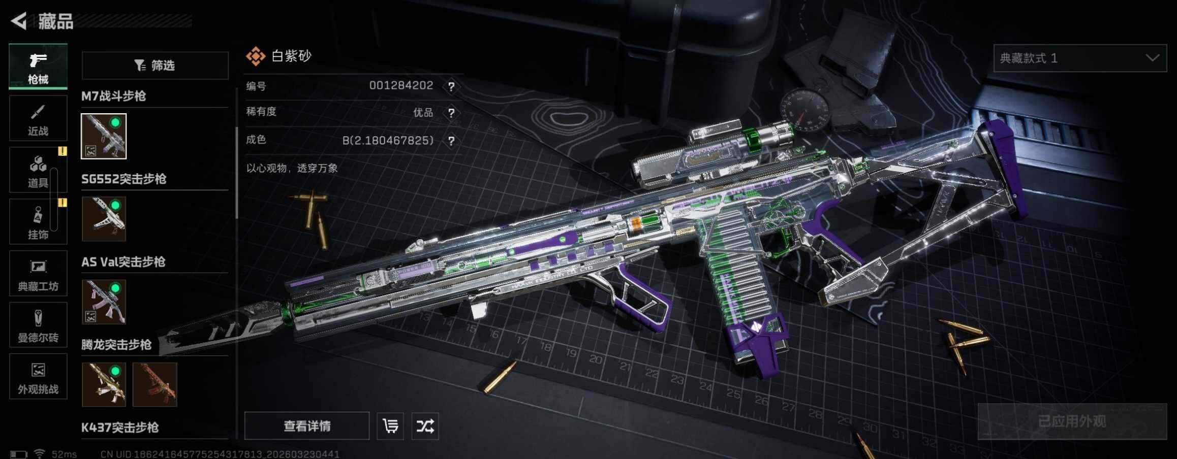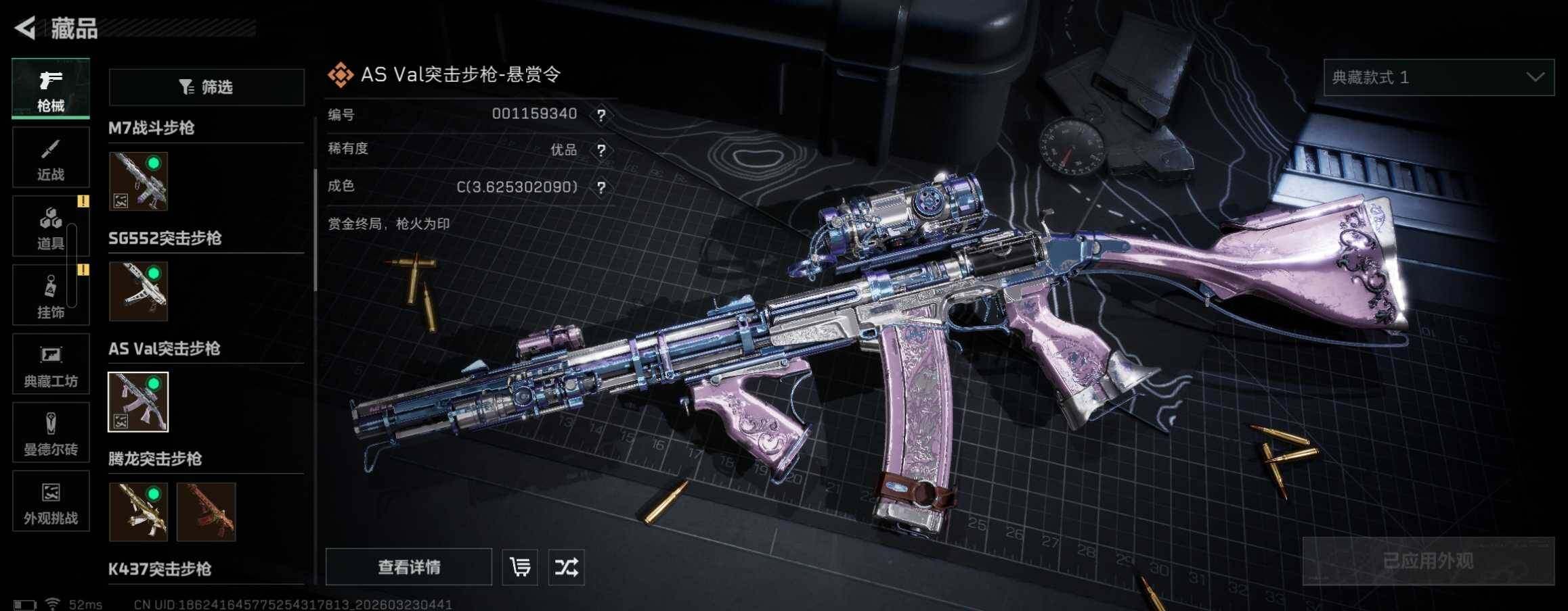 【典藏外观成色】:Vector冲锋枪-美杜莎(极品C),M7战斗步枪-棱镜攻势S2(优品B),AS Val突击步枪-