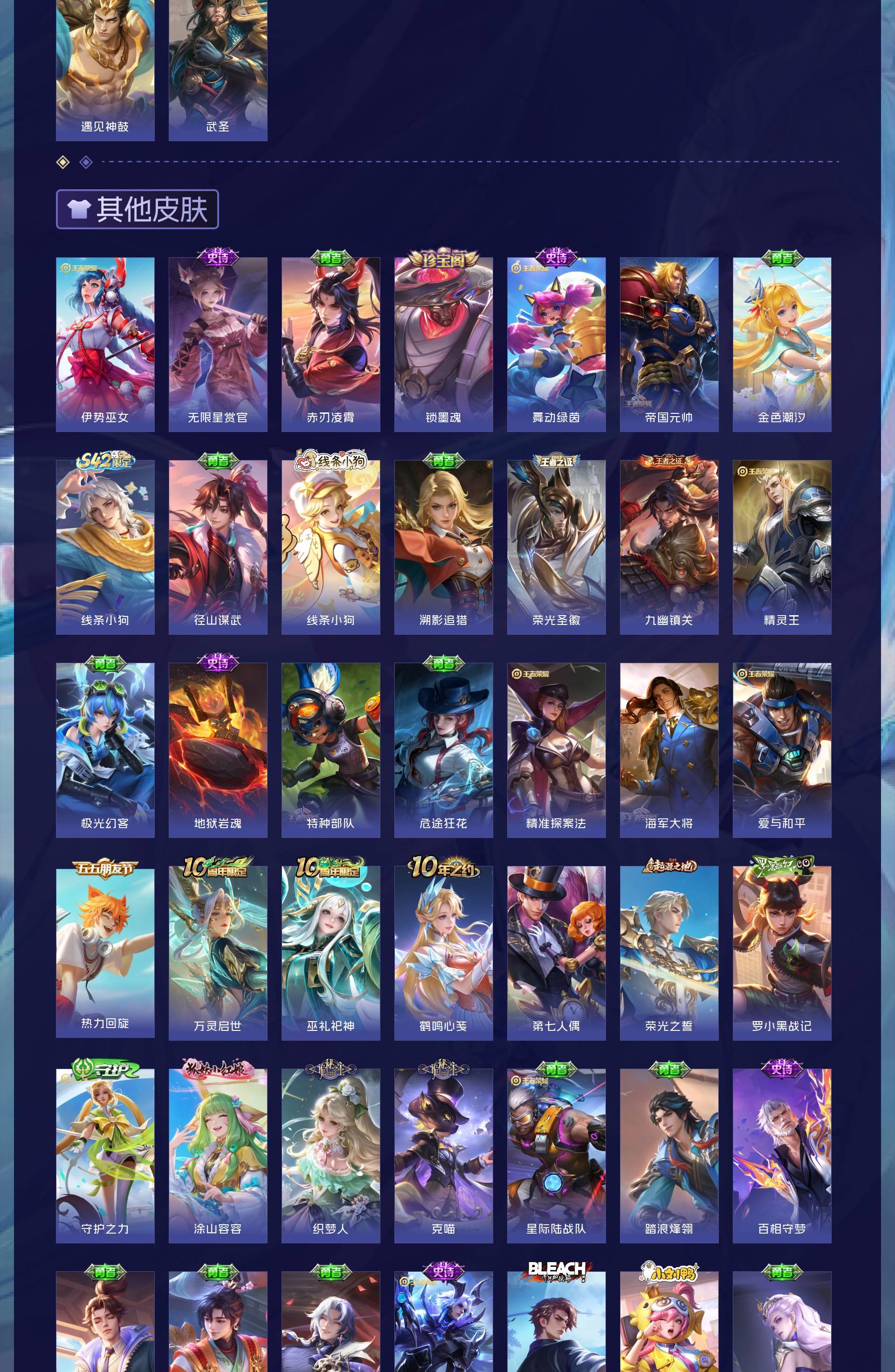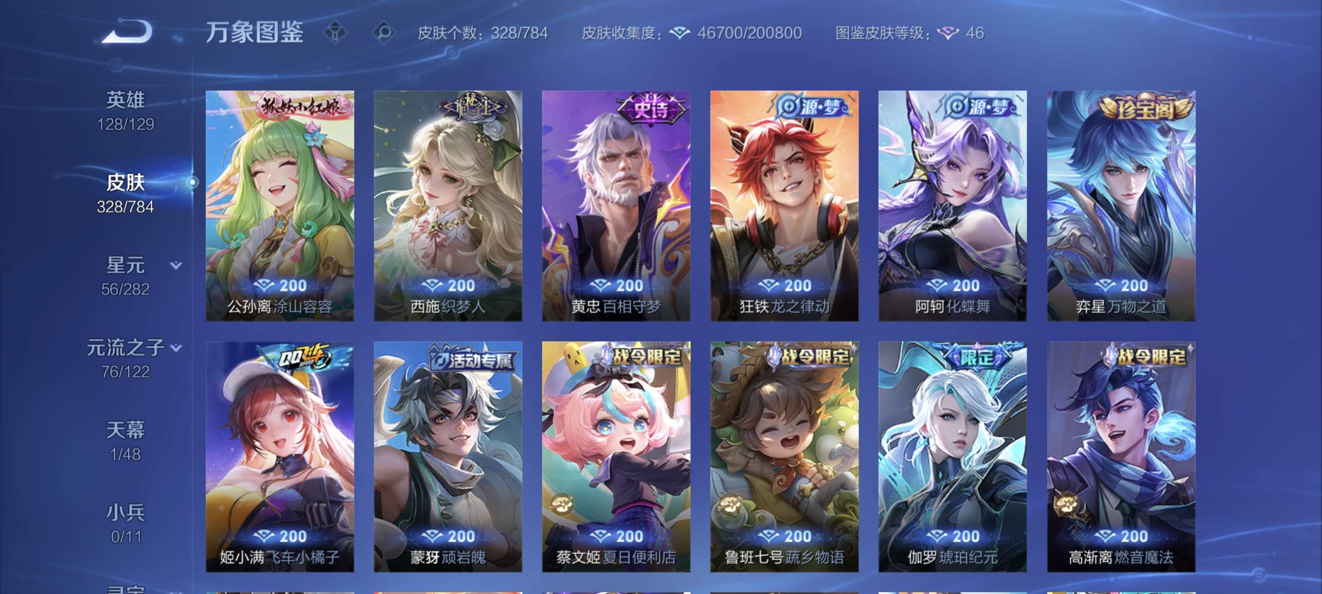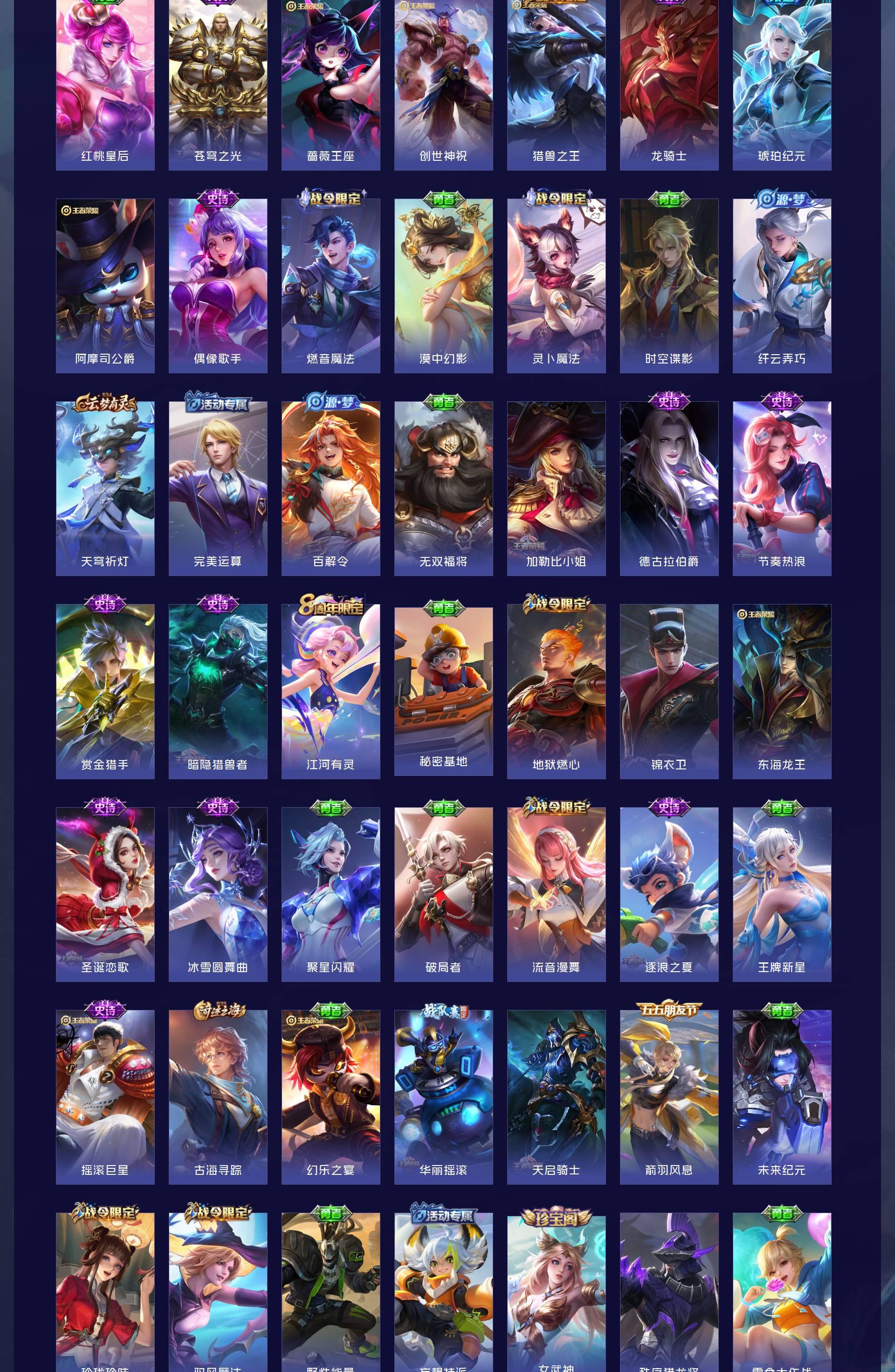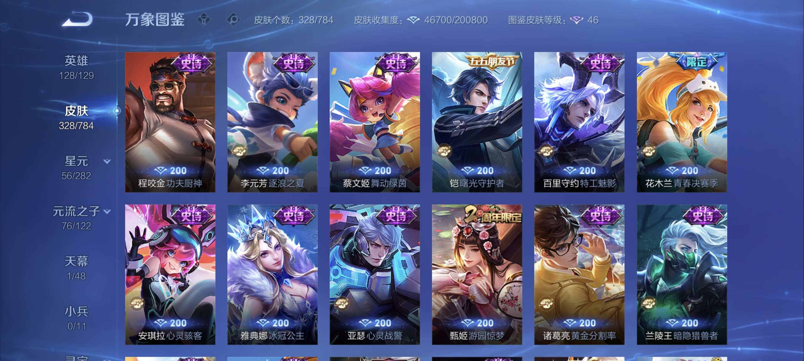荣耀典藏1、珍品传说1、传说星元2、传说17、史诗96、限定107、英雄128、皮肤328