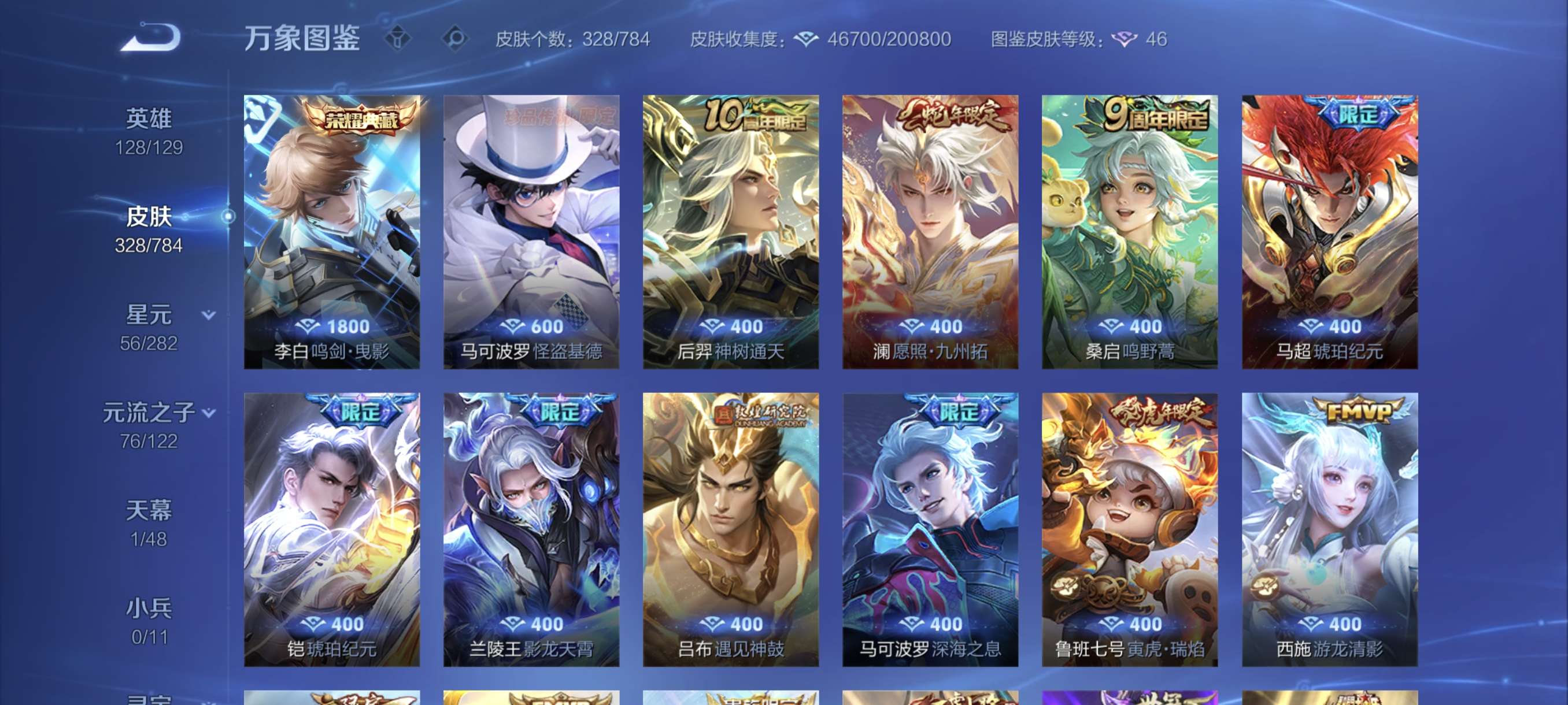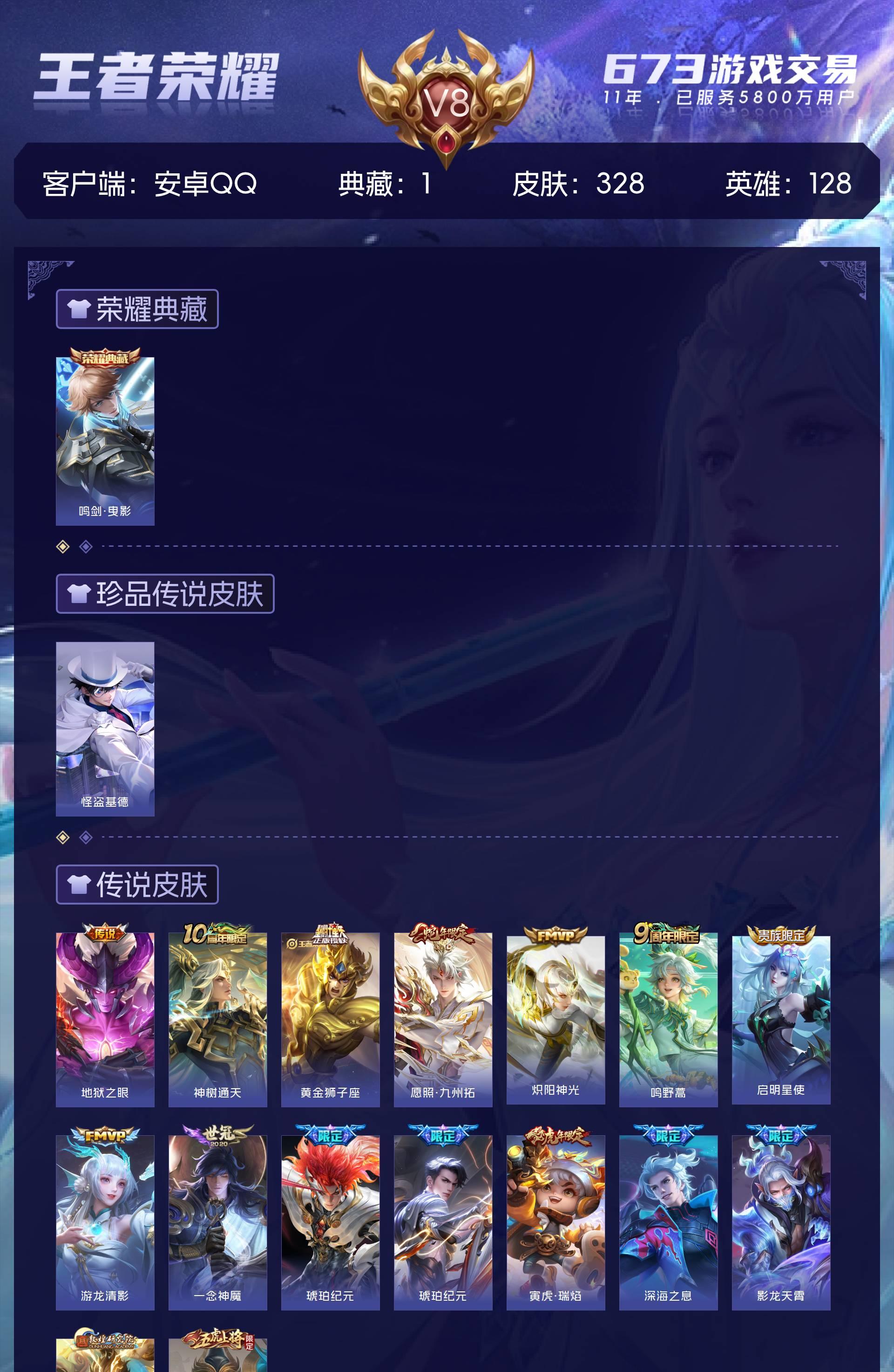 V8 皮肤328 英雄128 至圣王者 荣耀典藏1 珍品传说1 星传说2 传说17