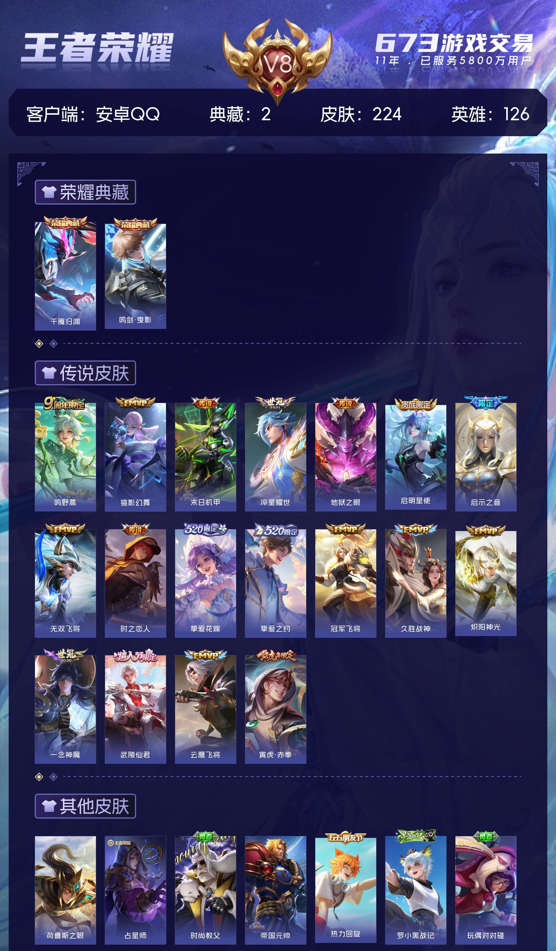 V8 皮肤224 英雄126 非凡王者 荣耀典藏2 传说18