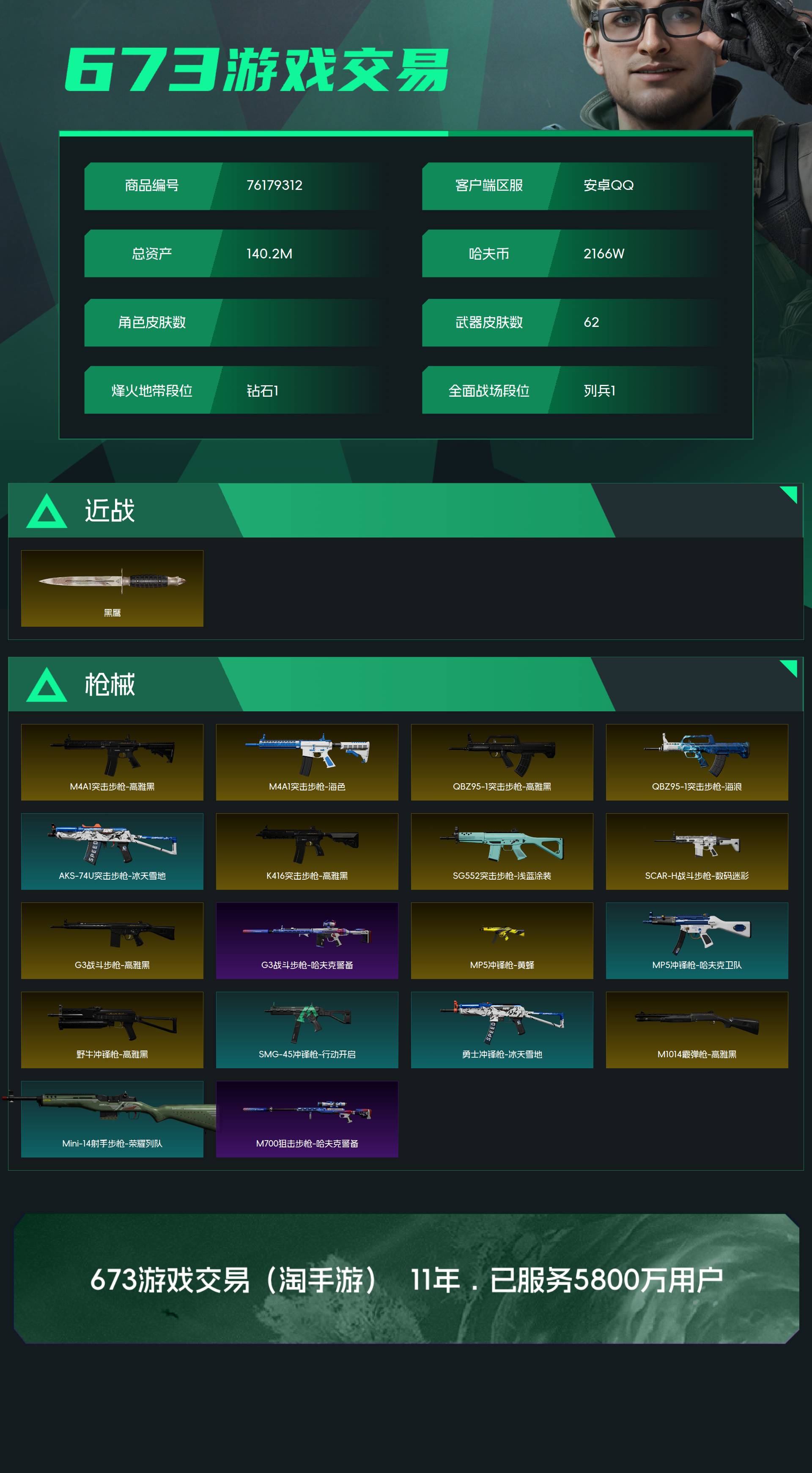 烽火段位钻石1 战场段位列兵1 总资产140.2M 哈夫币2166W 挂饰13 近战2 枪械62 载具3
