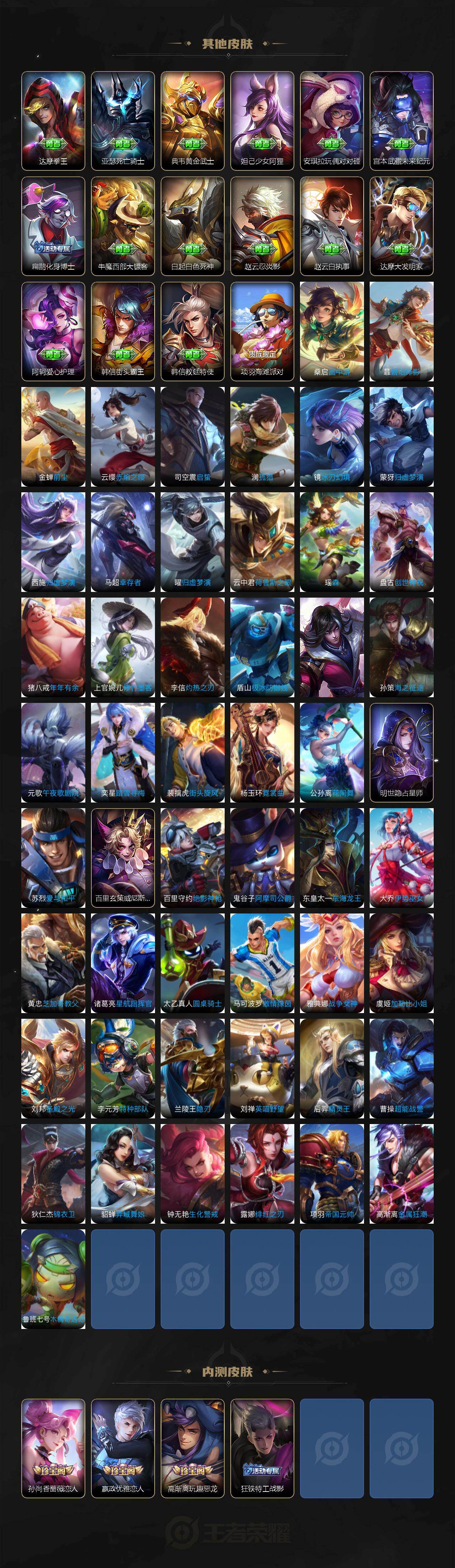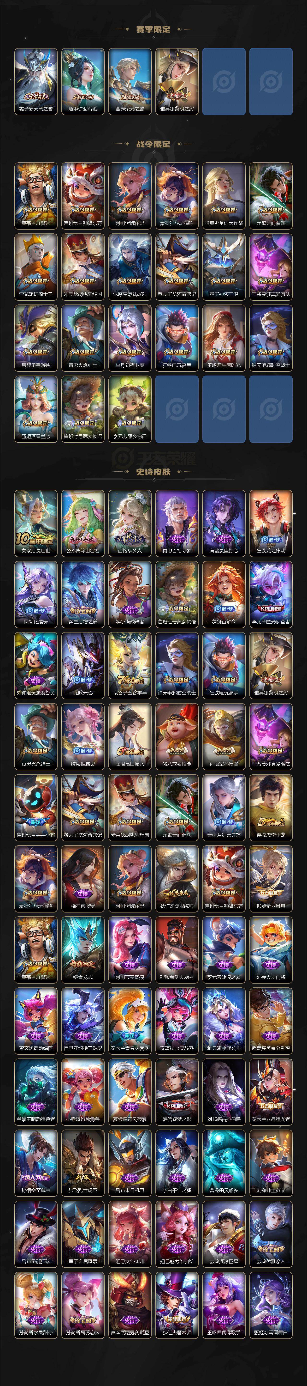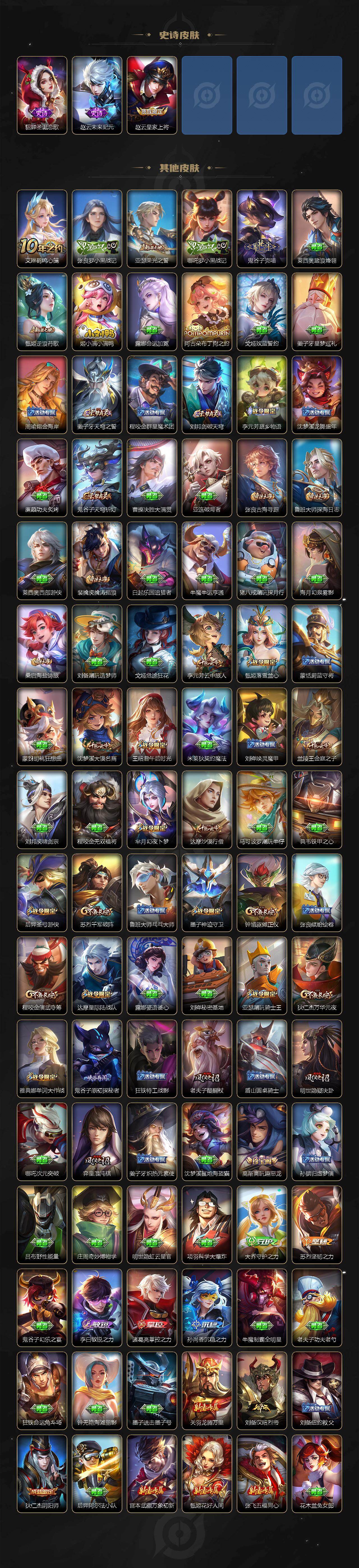 【限定皮肤】:姜子牙天穹之誓,狄仁杰阴阳师,赵云皇家上将,墨子神迹守卫,嬴政优雅恋人,孙尚香蔷薇恋人,鲁班七号狮舞东方,鲁班七号乒乒小将,庄周高山流水,高渐离玩趣恶龙,阿轲迷踪丽影,钟无艳超时空战士,芈月幻夜卜梦,元歌云间偶戏,元歌无心,甄姬落雪兰心,典韦蓝屏警告,狄仁杰魔术师,狄仁杰万华元夜,达摩