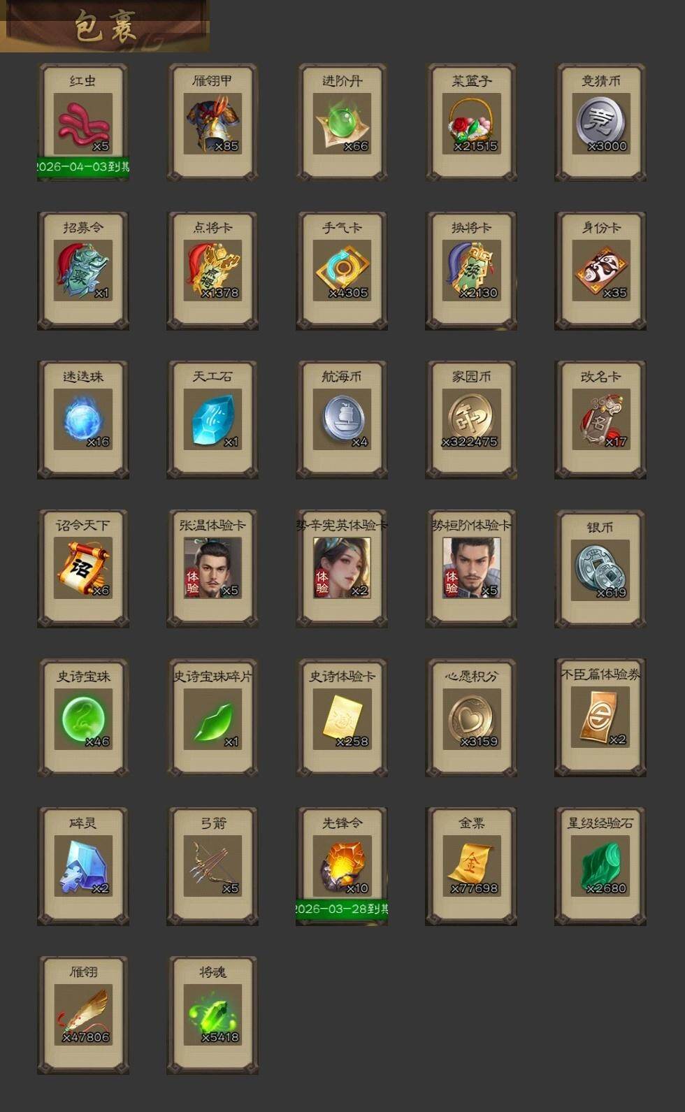 官阶:大将军;VIP等级:VIP12;史诗武将数量:80;动态皮肤数量:58;武将总数:461;史诗宝珠数量:46;将魂数量:5418;神将:11;魏国史诗武将:30;蜀国史诗武将:17;吴国史诗武将:15;群史诗武将:20