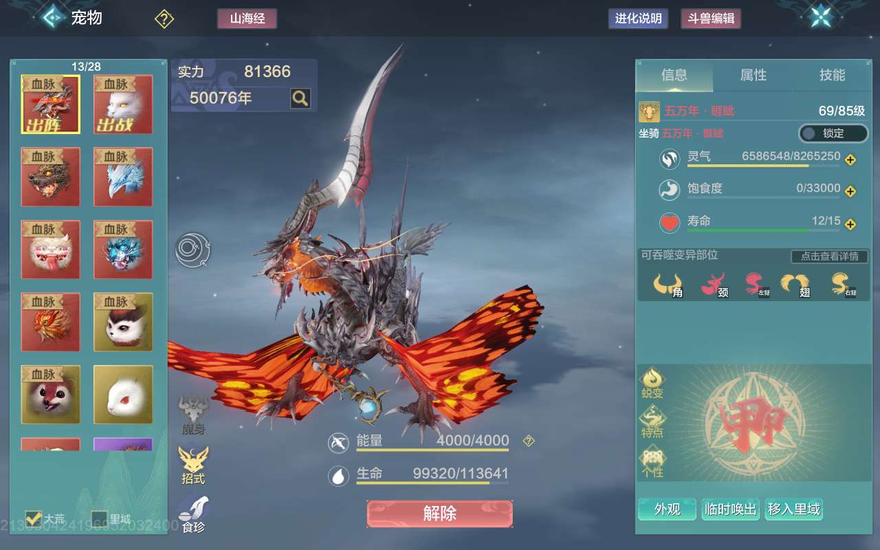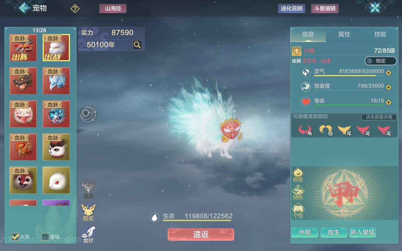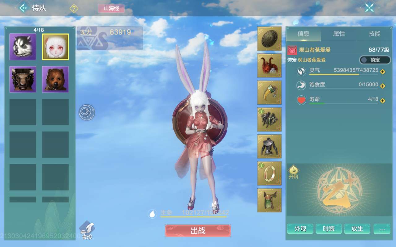 11万战力,7个五万年宠物,(狴犴 螭吻 睚眦 白泽 貔貅 霸下 飞廉)侍从兔媛媛,风元素2900攻