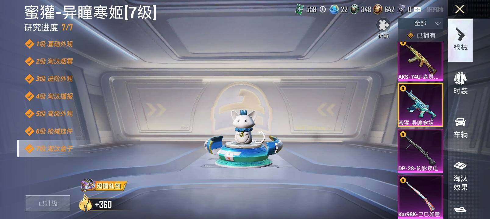 【7特效枪】 AKS-74U-森灵之息 (5级) Kar98K-巳巳如意 (5级) DP-28-豹影疾电 (5级) 蜜獾-