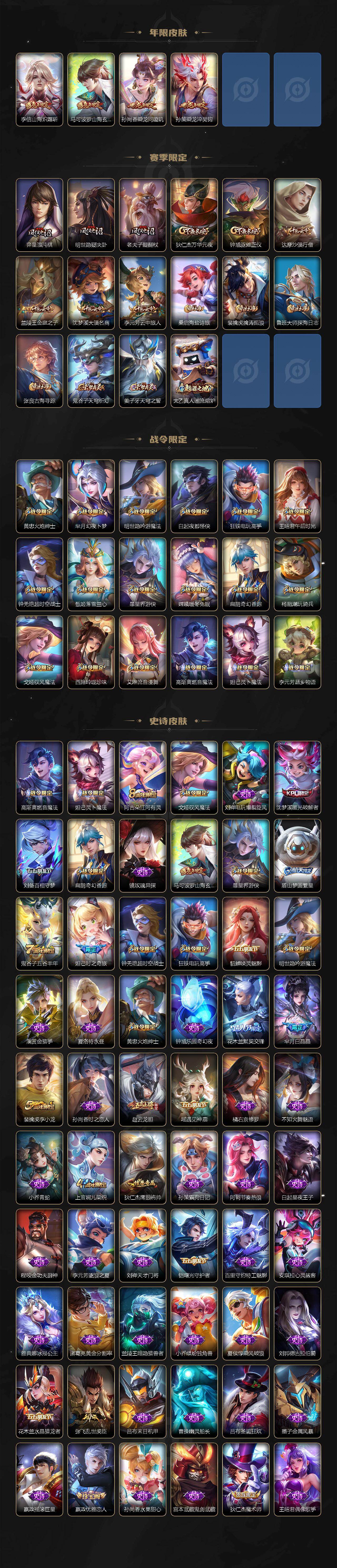 【传说皮肤】:桑启鸣野蒿,吕布曦玄引,孙尚香乘龙问璇玑,孙策乘龙淬吴钩,澜逐花归海,马可波罗妄想实况,夏洛特浮生妄,花木兰燃星之曲,项羽无限倾心,李信山海炽霜斩,吕布怒海麟威,李白诗剑行,马可波罗深海之息,孙策挚爱之约,孙策末日机甲,周瑜音你心动,镜炽阳神光,虞姬启明星使,刘备时之恋人,花木兰冠军飞将,后羿黄金射手座