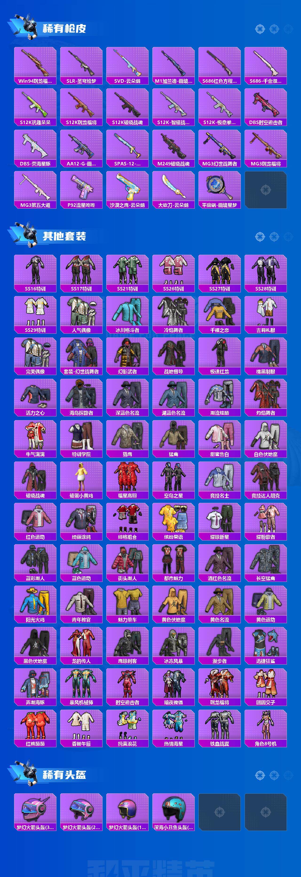 【粉色枪皮等级】:Kar98K-巳巳如意(二级),Mk14-福马献瑞(五级),DP-28-豹影疾电(四级),MG3-洛神天依(五级)