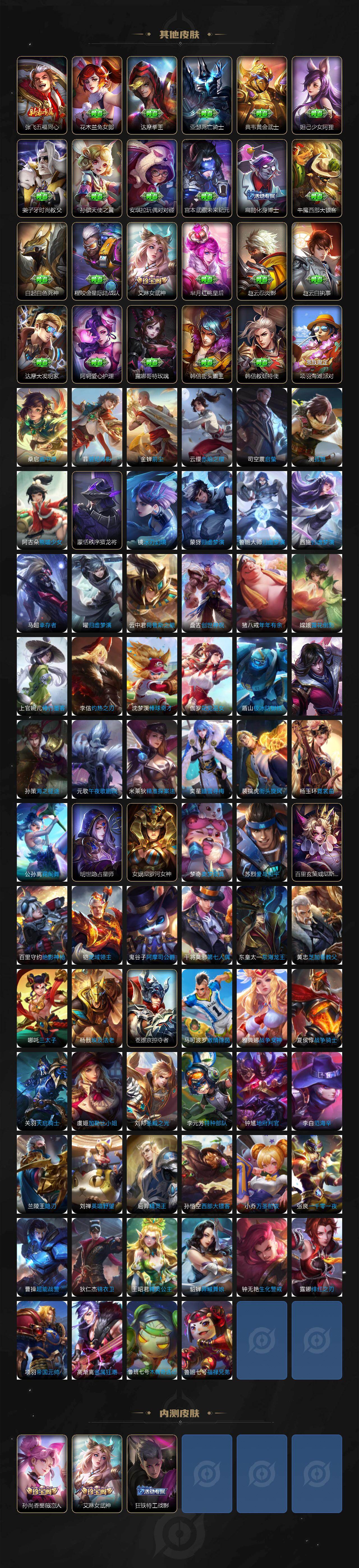 【传说皮肤】:马可波罗妄想实况,曜山海苍雷引,李信山海炽霜斩,李白诗剑行,孙尚香异界灵契,虞姬启明星使,曜云鹰飞将,刘备时之恋人,梦奇胖达荣荣,后羿黄金射手座,李白凤求凰,孙尚香末日机甲,孙悟空地狱火,狄仁杰超时空战士