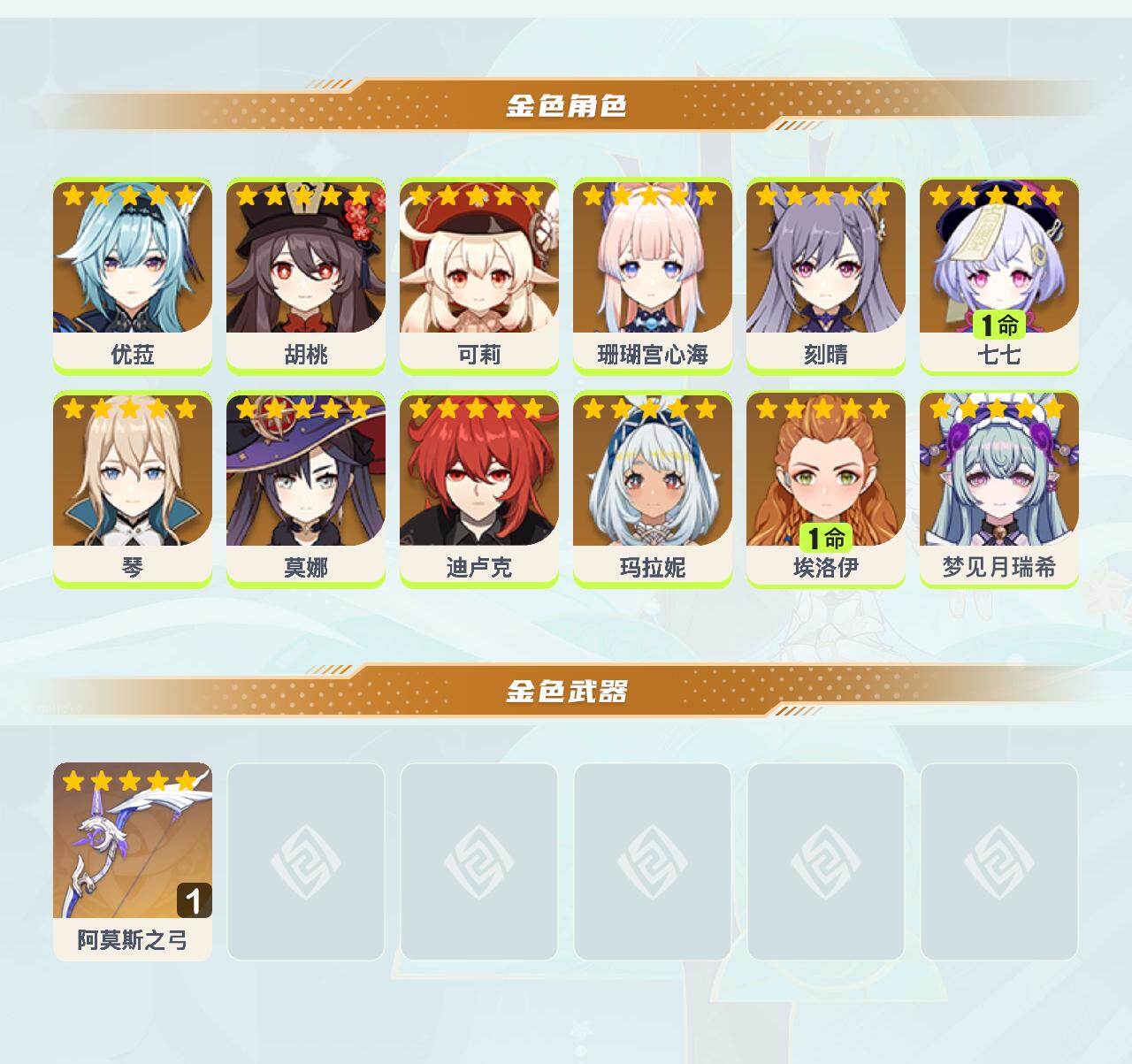 【YS1361】52级/14黄/女主/12个五星角色/1个五星武器/胡桃/珊瑚宫心海/1命七七/玛拉妮/琴/优菈/刻晴/莫娜/可莉/0命埃洛伊/迪卢克/梦见月瑞希/阿莫斯之弓