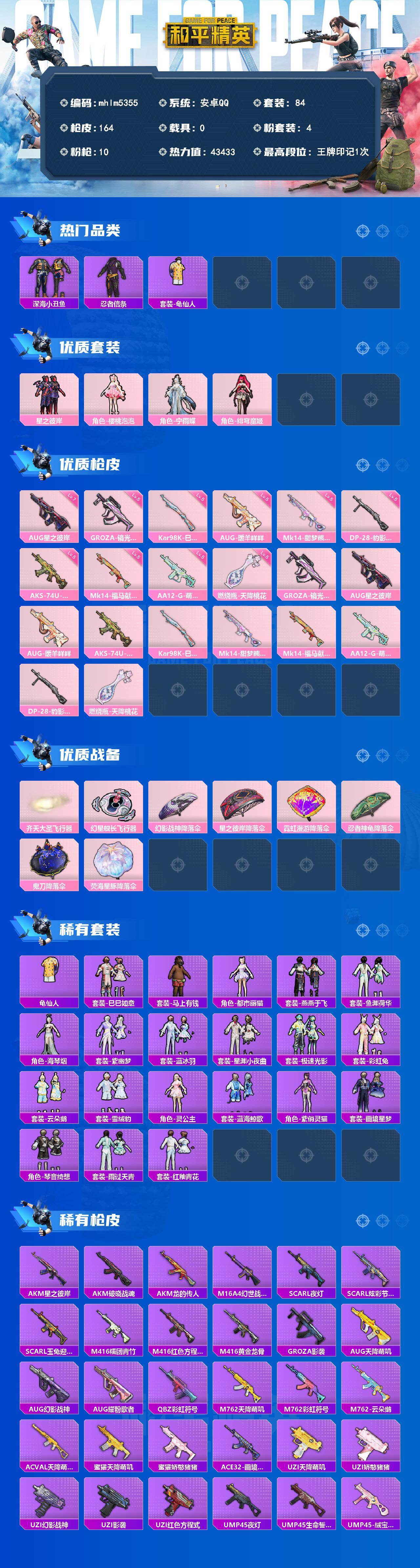 安卓 手Q-4粉装-10特效枪-0载具-3粉色飞行器-43433热力值-1王牌印记-84套装-164枪皮