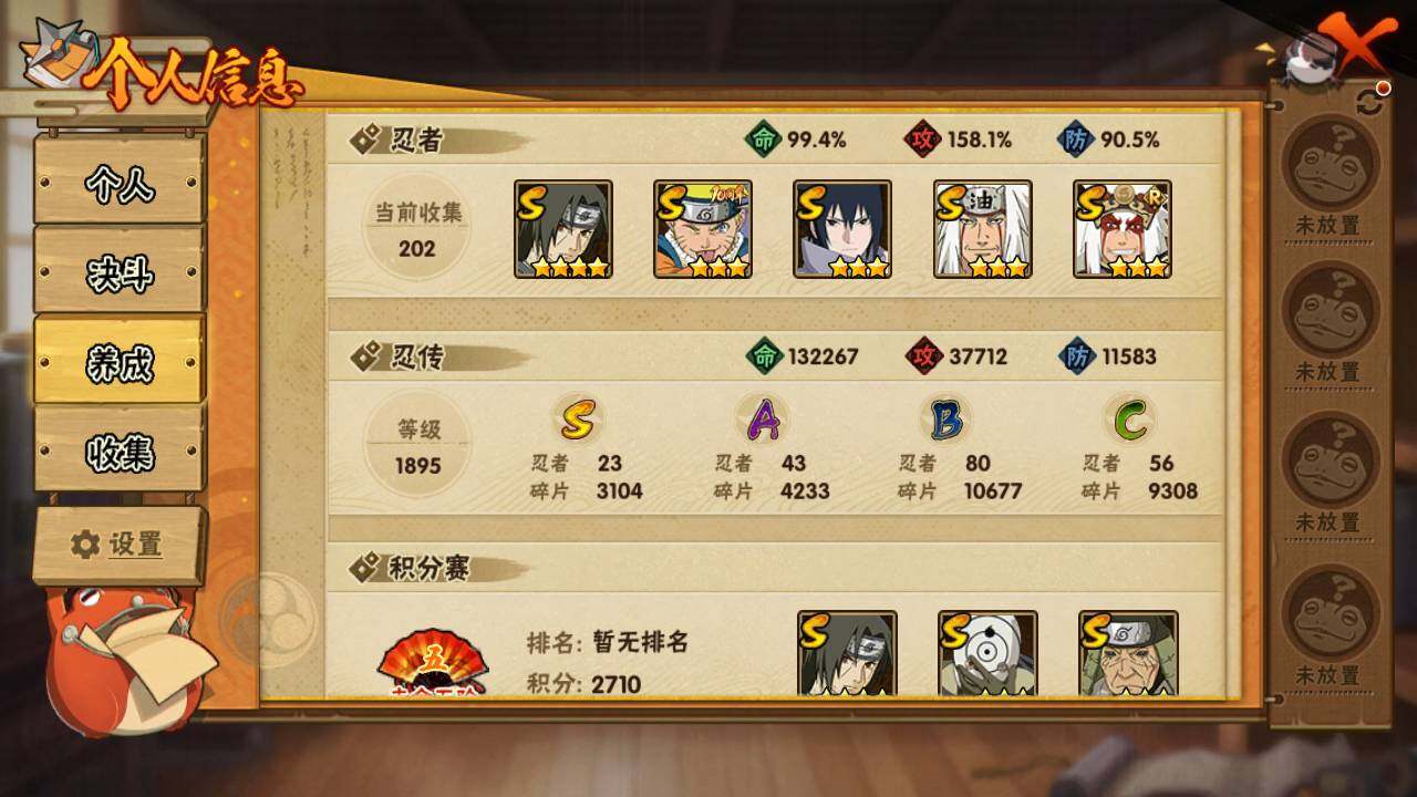 V11 958万战力 23S-43A 有1传承奥义图 金币1.25万 有熊猫 十尾带土60片 鬼灯幻月69片 忍战艾87片 LL5973