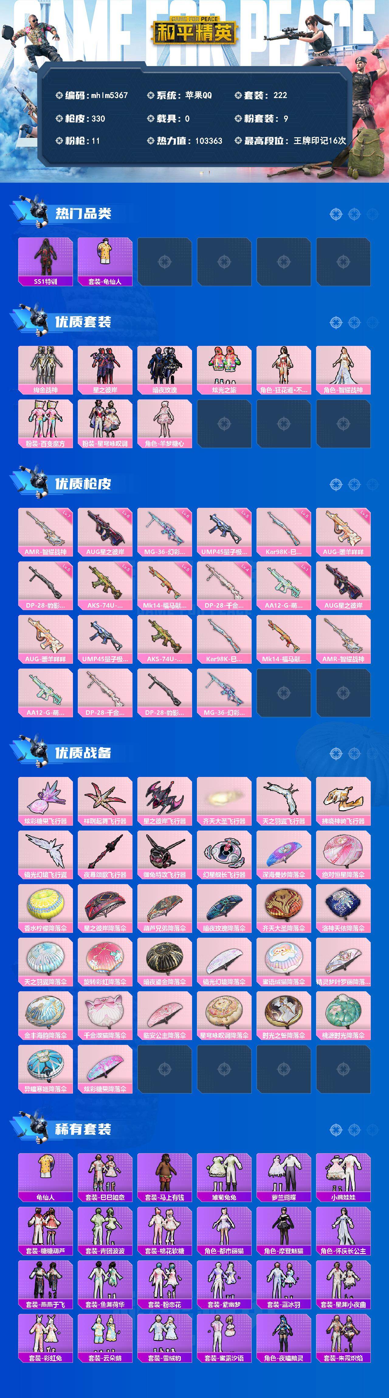 苹果 手Q-9粉装-11特效枪-0载具-10粉色飞行器-103363热力值-16王牌印记-222套装-330枪皮