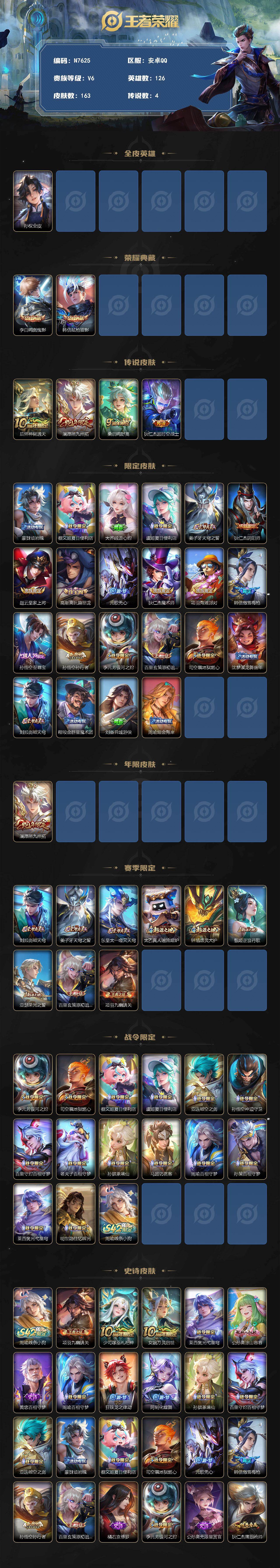 安卓Q-V6-至尊星耀III段位-126英雄-163皮肤-2典藏皮肤-4传说-45史诗
