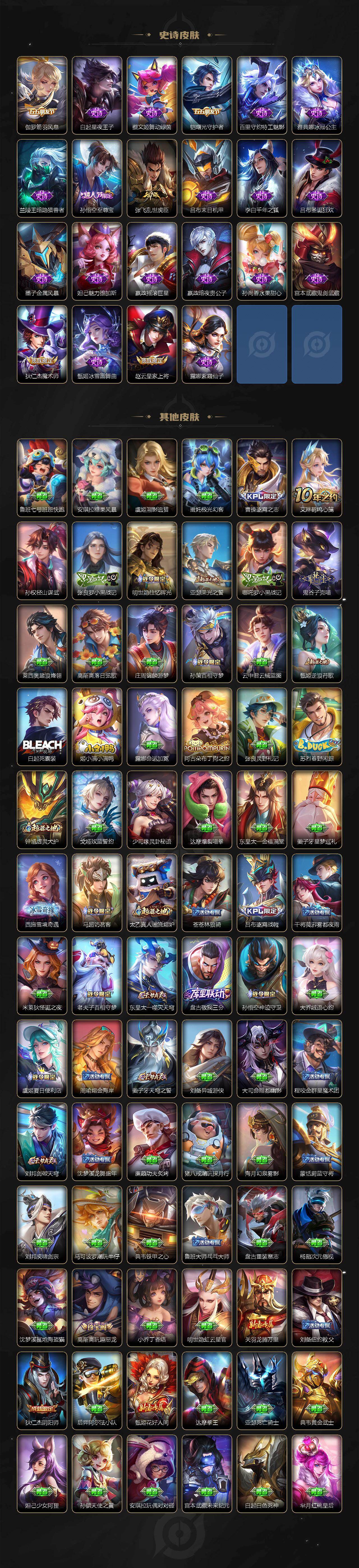 【限定皮肤】:蒙犽顽岩魄,蔡文姬夏日便利店,大乔绒语心约,虞姬夏日便利店,姜子牙天穹之誓,狄仁杰阴阳师,赵云皇家上将,高渐离玩趣恶龙,元歌无心,狄仁杰魔术师,项羽海滩派对,韩信傲雪梅枪,孙悟空至尊宝,孙悟空孙行者,李元芳银河之约,百里玄策原初追逐者,司空震地狱燃心,沈梦溪龙