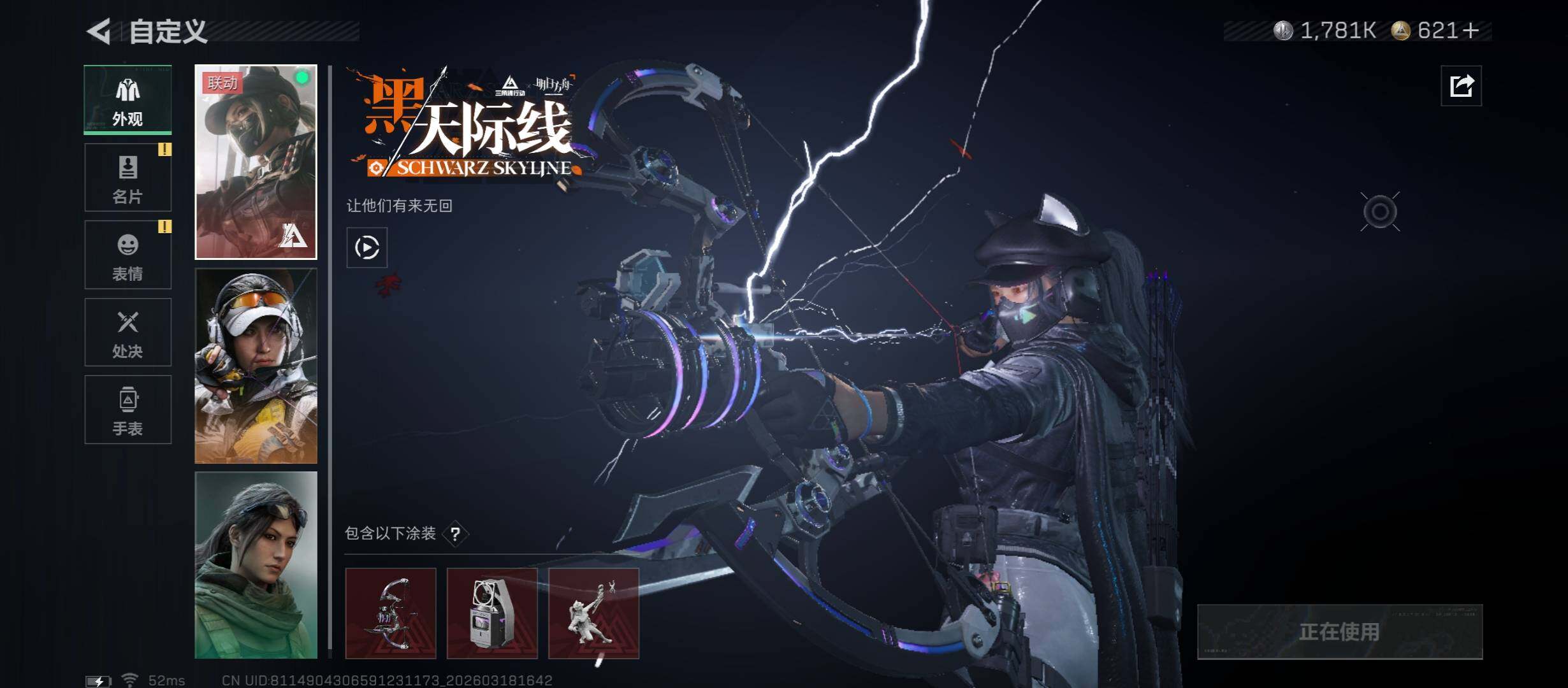 【热门皮肤组合搭配:单红皮+单刀皮-黑天际线+信条+中额资产215M】【Q区三端互通】【无二协助处理】YXz9074-特勤处:仓库8级/靶场5级/训练中心6级-总资产215m-哈夫币178w-烽火等级:60级