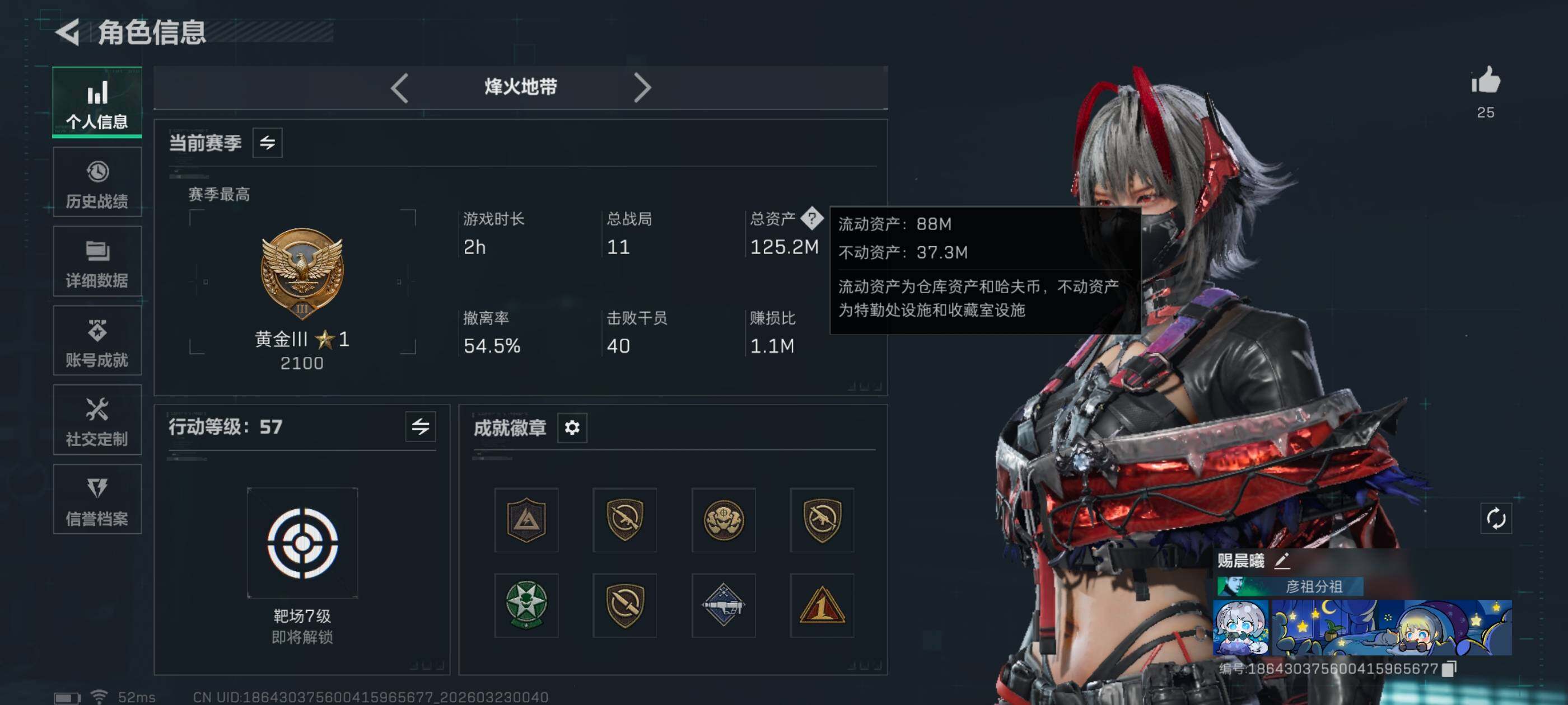 125m总资产-7824k哈夫币-57烽火等级-黄金-50战场等级-上等兵【