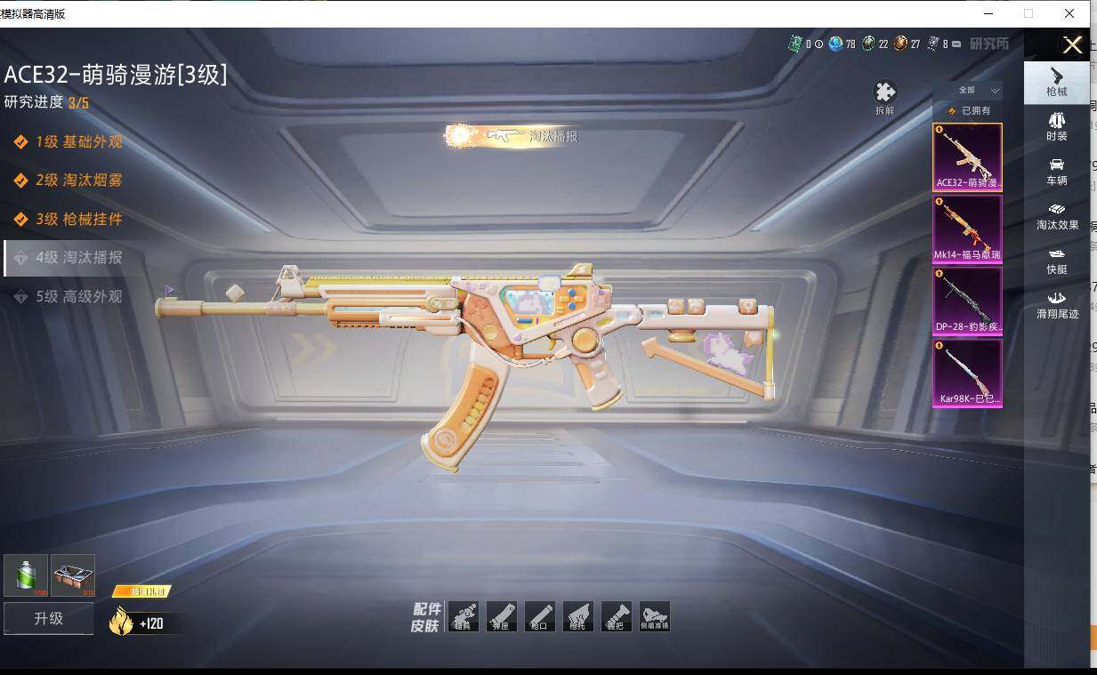 【粉色枪皮等级】:ACE32-萌骑漫游(三级),Kar98K-巳巳如意(五级),Mk14-福马献瑞(五级),DP-28-豹影疾电(五级)