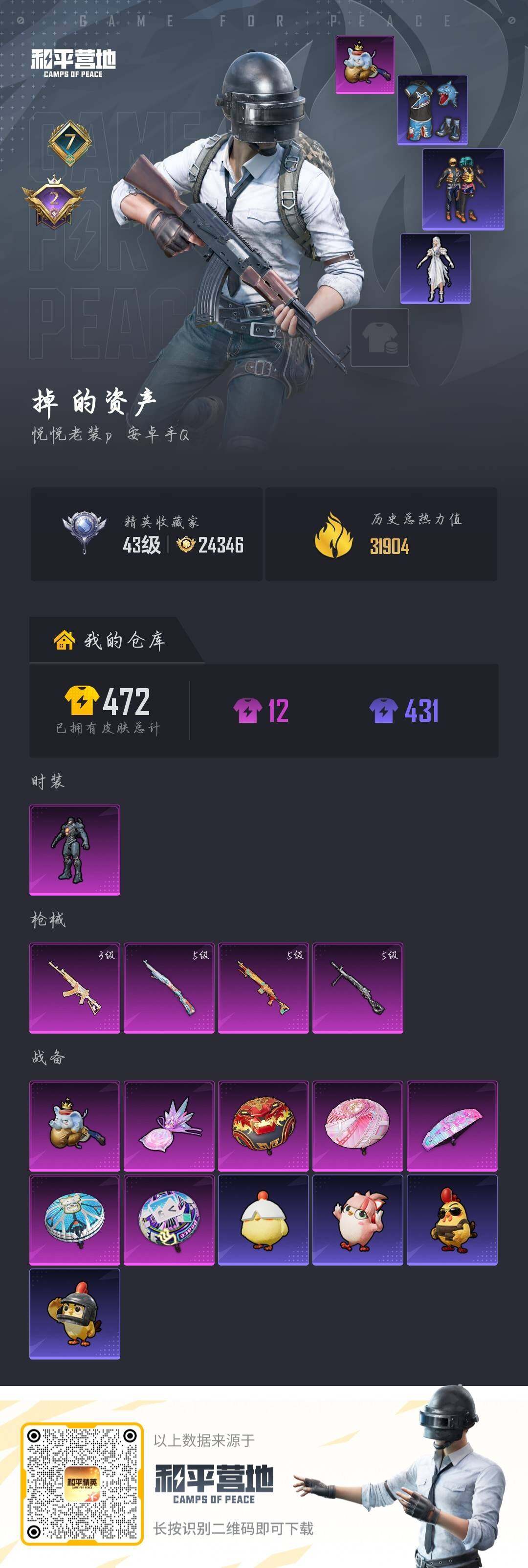 安卓 手Q-1粉装-4特效枪-0载具-2粉色飞行器-31904热力值-7王牌印记-104套装-125枪皮