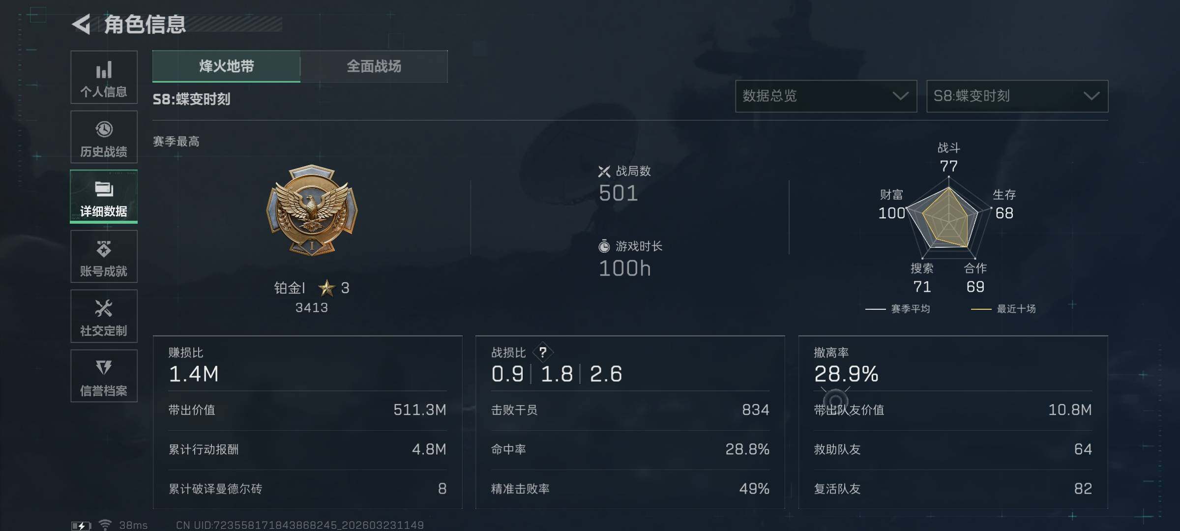 25m总资产-871k哈夫币-60烽火等级-铂金-50战场等级-军士长