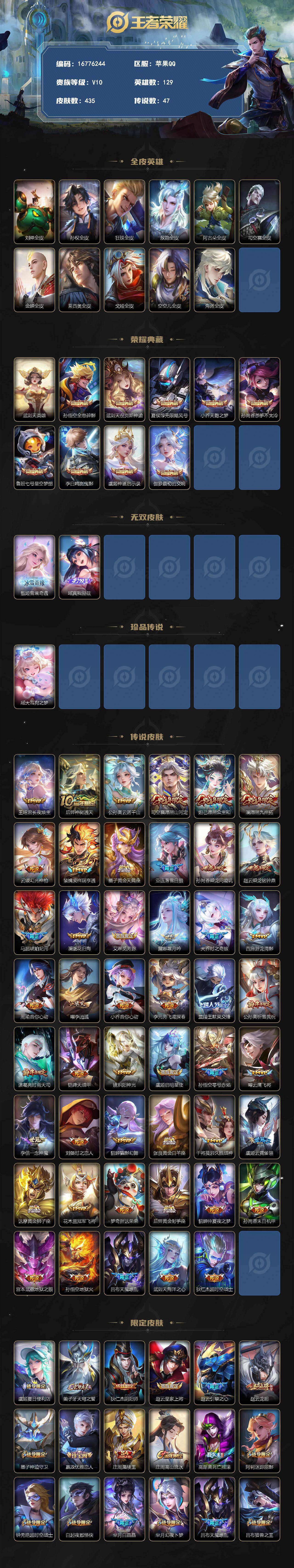 【16776244】苹果Q-V10-最强王者段位-129英雄-435皮肤-9典藏皮肤-1典藏英雄-2无双-1珍品传说-47传说-127史诗